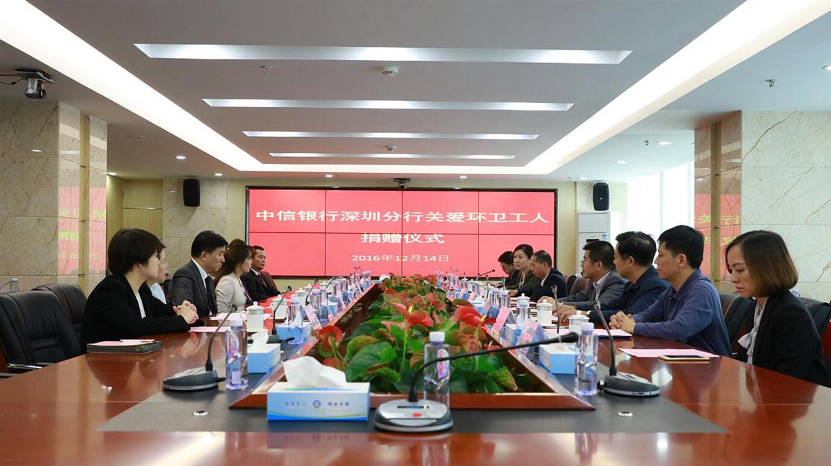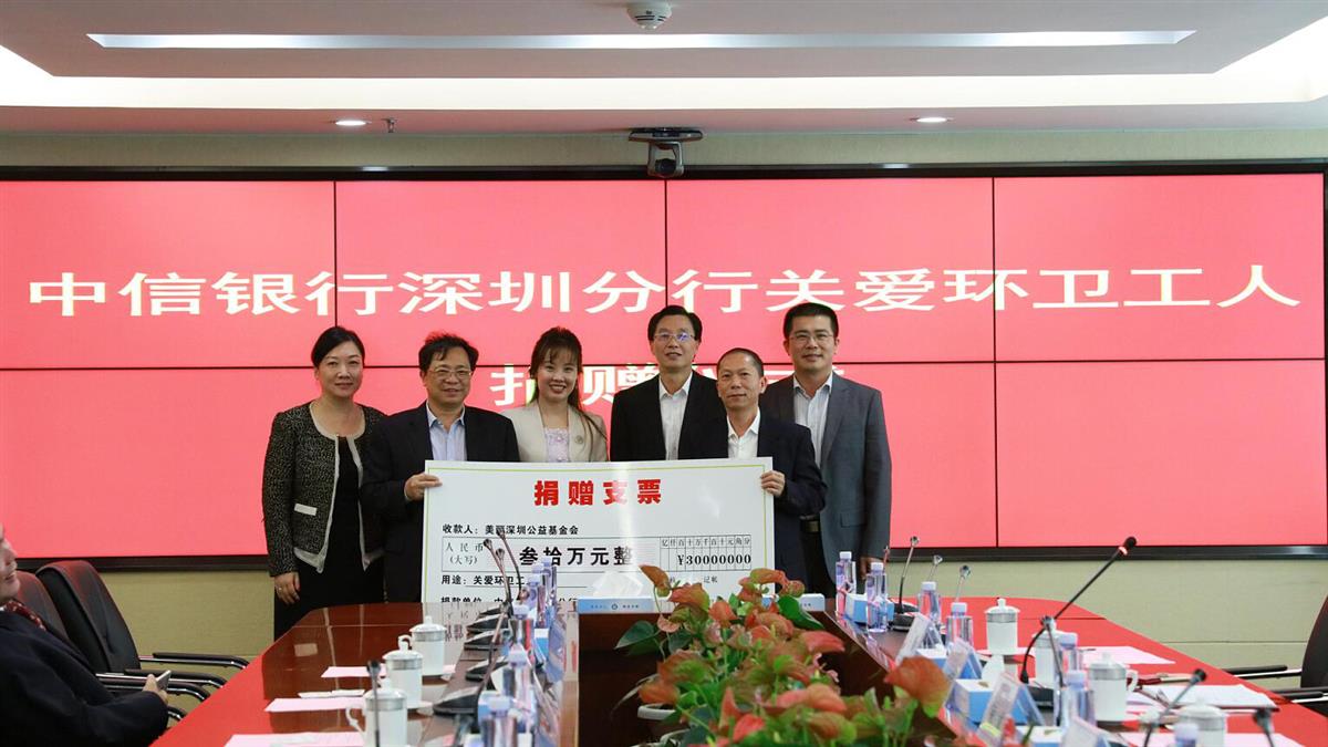 2016年12月14日,中信银行深圳分行关爱环卫工人捐赠仪式在市城管局举行。中信银行深圳分行向美丽深圳公益基金会捐赠三十万元,用于关爱环卫工人相关项目。市城管局局长王国宾,党委副书记丘孟军,中信银行深圳分行行长陈许英,美丽深圳公益基金会副理事长周斌、秘书长张晓玮,基金会理事单位深能环保及腾邦集团代表出席捐赠仪式。双方希望能借此举引导和凝聚更多的市民、企业及社会各方力量,积极参与城市管理,热心推动和参与关爱环卫工人活动。