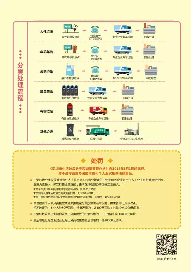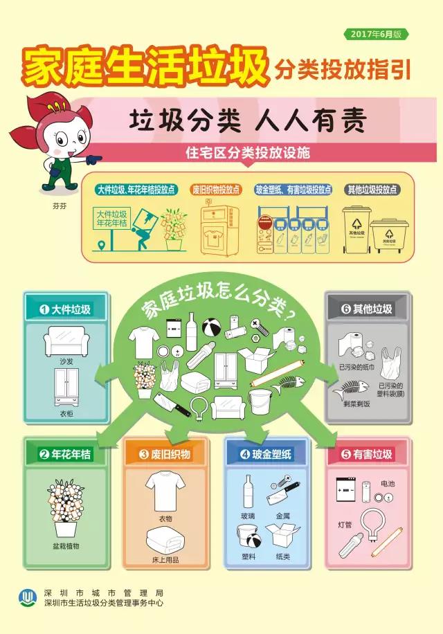 《指引》对住宅区(城中村)垃圾分类投放设施、容器标准化配置、家庭生活垃圾的分类类别和投放方法、垃圾分类处理收运处理体系及处罚措施做了清晰的说明与描述。目前,市区城管部门正在加速推进住宅区(城中村)生活垃圾分类设施的规范设置,计划今年10月底前全部完成,并配套完善收集、运输和处理体系。也意味着垃圾分类将成为每一位深圳市民应尽的义务。