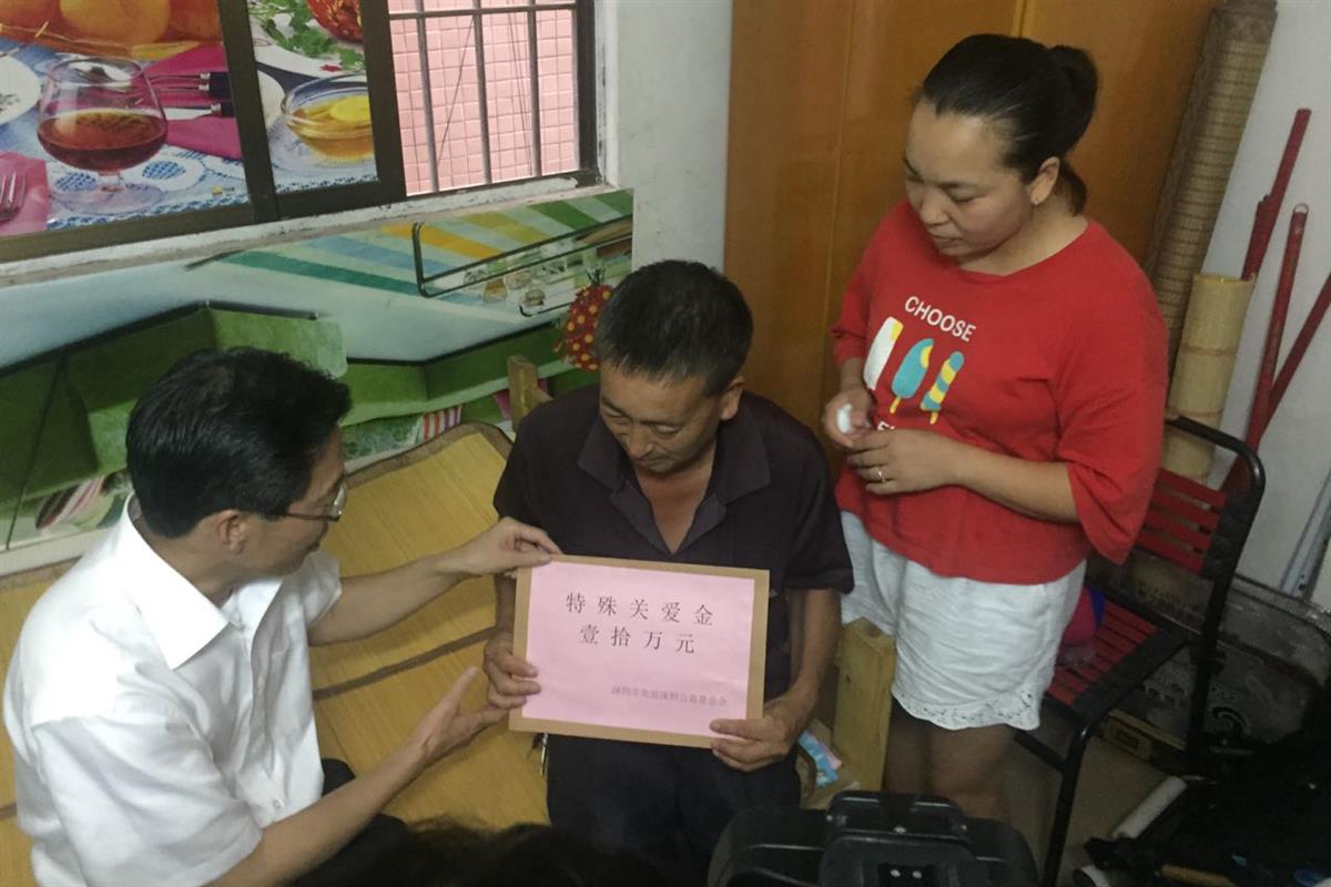 6月8日下午,在光明新区一间普通的民房,市城管局局长王国宾及美丽深圳公益基金会秘书长张晓玮一行来到环卫工人张先婵生前的家进行慰问,并送上由美丽深圳公益基金会提供的10万元特殊关爱金,向这位环卫工人和家属致敬,向社会弘扬大爱精神,传递深圳这座城市爱的正能量。