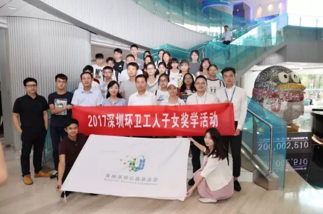 8月25日,美丽深圳公益基金会联合深圳市城管局共同举办了第二季环卫工人子女大学生奖学活动。今年基金会将为参加2017年高考并被大专及以上院校录取的约90名环卫工人子女发放奖学金5000元/人。本次活动邀请了部分环卫工人子女代表,以及2016年考取优秀大学的环卫工人子女代表共24人参观腾讯公司,游览莲花山公园,并开展座谈活动。市城管局副巡视员杨雷、美丽深圳公益基金会秘书长张晓玮及理事单位腾邦集团代表共同出席活动。