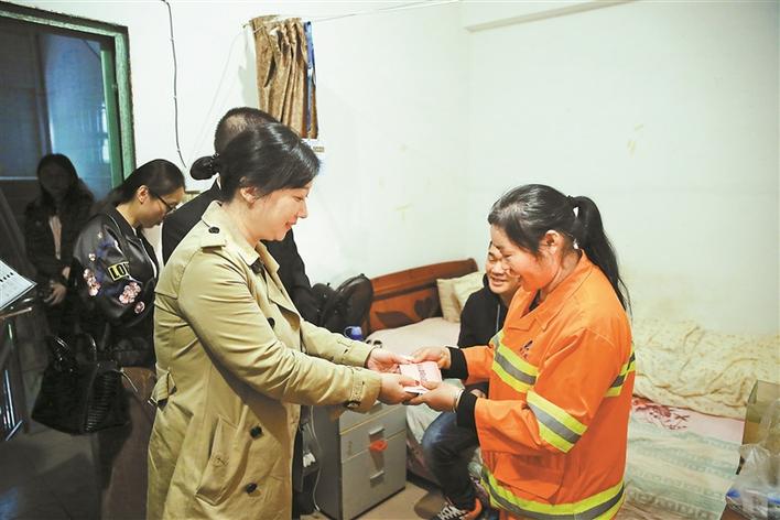 基金会秘书长张晓玮为环卫工人代表邹淑英送上1万元慰问金
