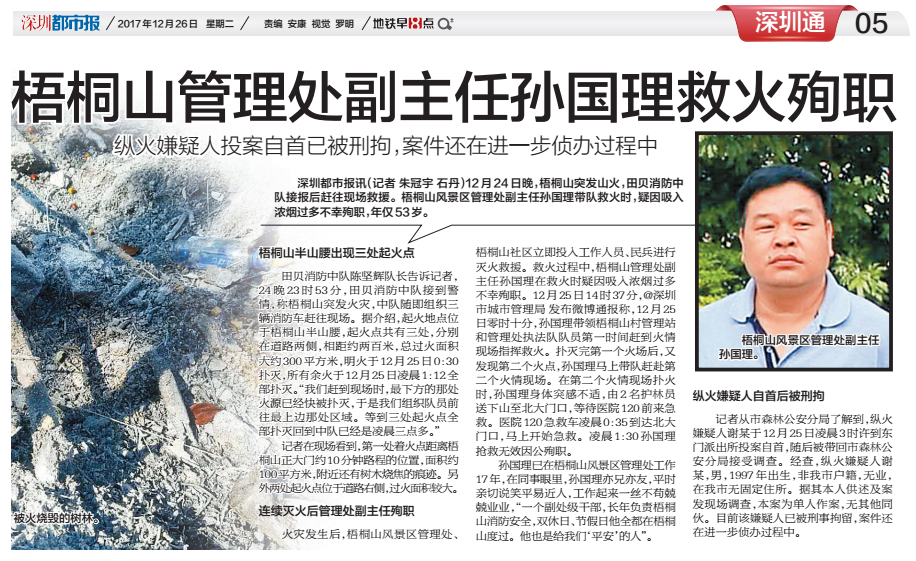 2017年12月24日晚上23:50,深圳梧桐山发生山林火灾。梧桐山管理处副主任孙国理同志带领梧桐山村管理站和管理处执法队队员第一时间赶到火情现场(当时约为12月25日0:10)指挥救火。在第二个火情现场扑火时,孙国理同志身体突感不适,经120急救车到达急救,凌晨1:30孙国理同志抢救无效因公殉职。