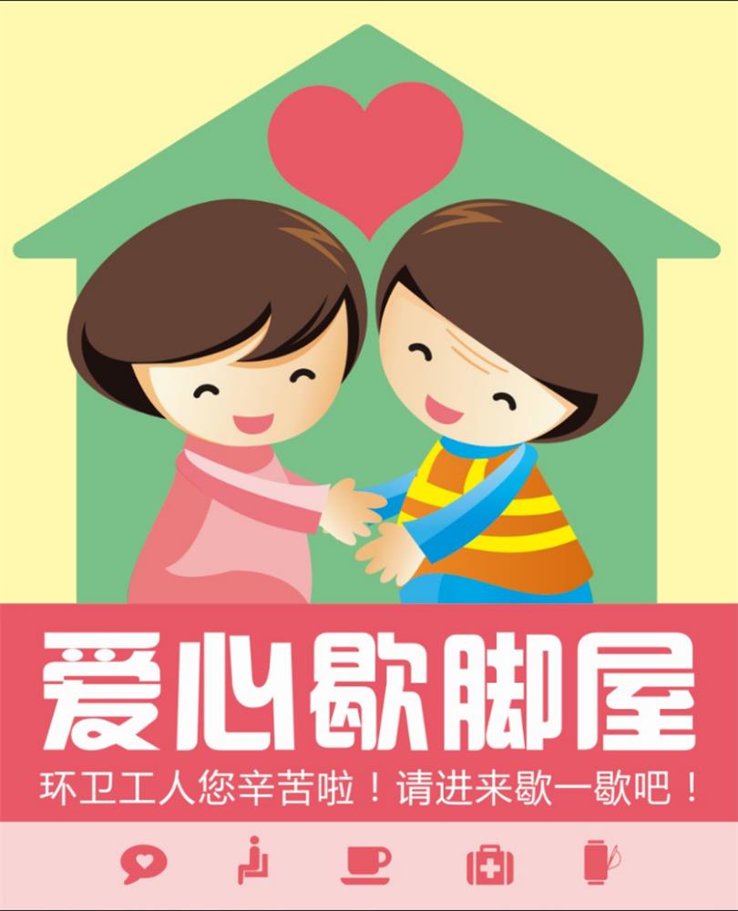 2016年市城管局联合各区城管部门在全市共同创建了3000个“爱心歇脚屋”,是基于对城市美容师提供人文关怀而发起的一个活动。为环卫工人提供一个可以饮水、休息、避雨,有外伤药箱等基本应急需求的场地。