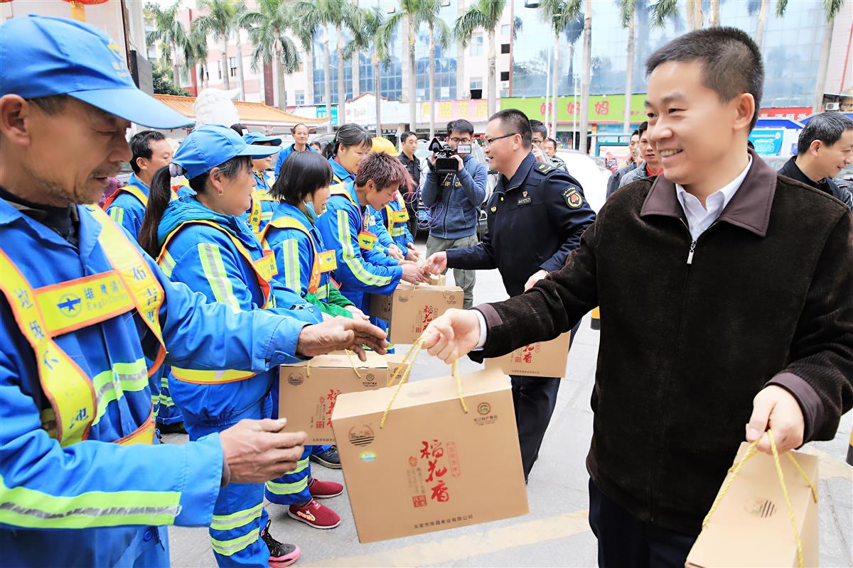 2月7日上午,美丽深圳公益基金会联合市城管局共同开展迎春慰问活动,到现场看望慰问我市一线优秀环卫作业班组,给在春节前仍坚守在一线的环卫工人送上慰问品和慰问金,祝福他们春节愉快、阖家幸福、万事如意。