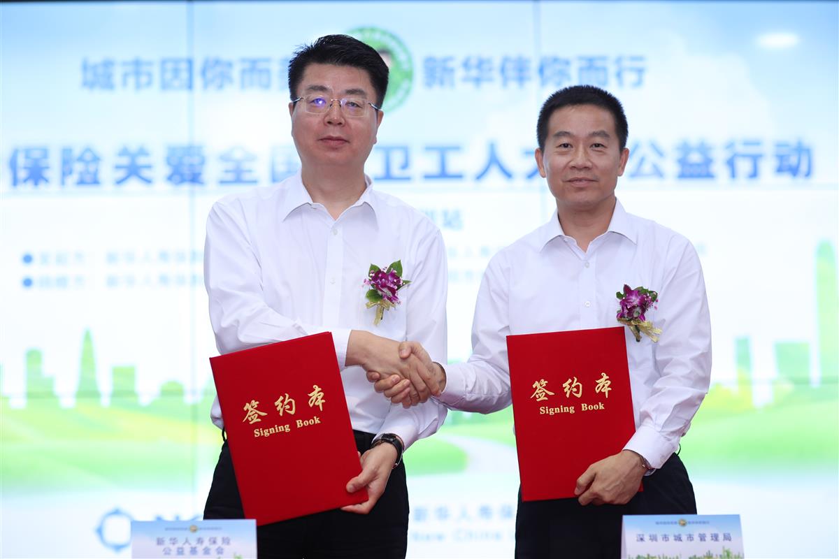 杨雷副巡视员代表深圳市城市管理局与新华人寿保险公益基金会签订捐赠协议。最后,杨局代表受捐方市城管局对新华保险公司免费为环卫工人捐赠人身意外保险表示感谢,对广大环卫工人用勤劳的双手和辛勤的汗水创造了不平凡的业绩表示肯定。近年来,市城管局联合美丽深圳公益基金会持续开展关爱环卫工人活动,带动了众多爱心企业加入到关爱环卫工人的行列中,此次新华保险为深圳一线环卫工人捐赠专属保险保障,正是体现了社会企业对环卫工人群体的关心。同时更重要的是,希望通过此类关爱活动的持续开展唤起大家对环卫工人劳动成果的尊重,大家自觉的维护环境卫生。相信在社会各方的努力下,关爱环卫工人一定能够成为深圳城市文明的亮丽名片,垃圾不落地也一定能成为全体深圳市民的自觉行动。