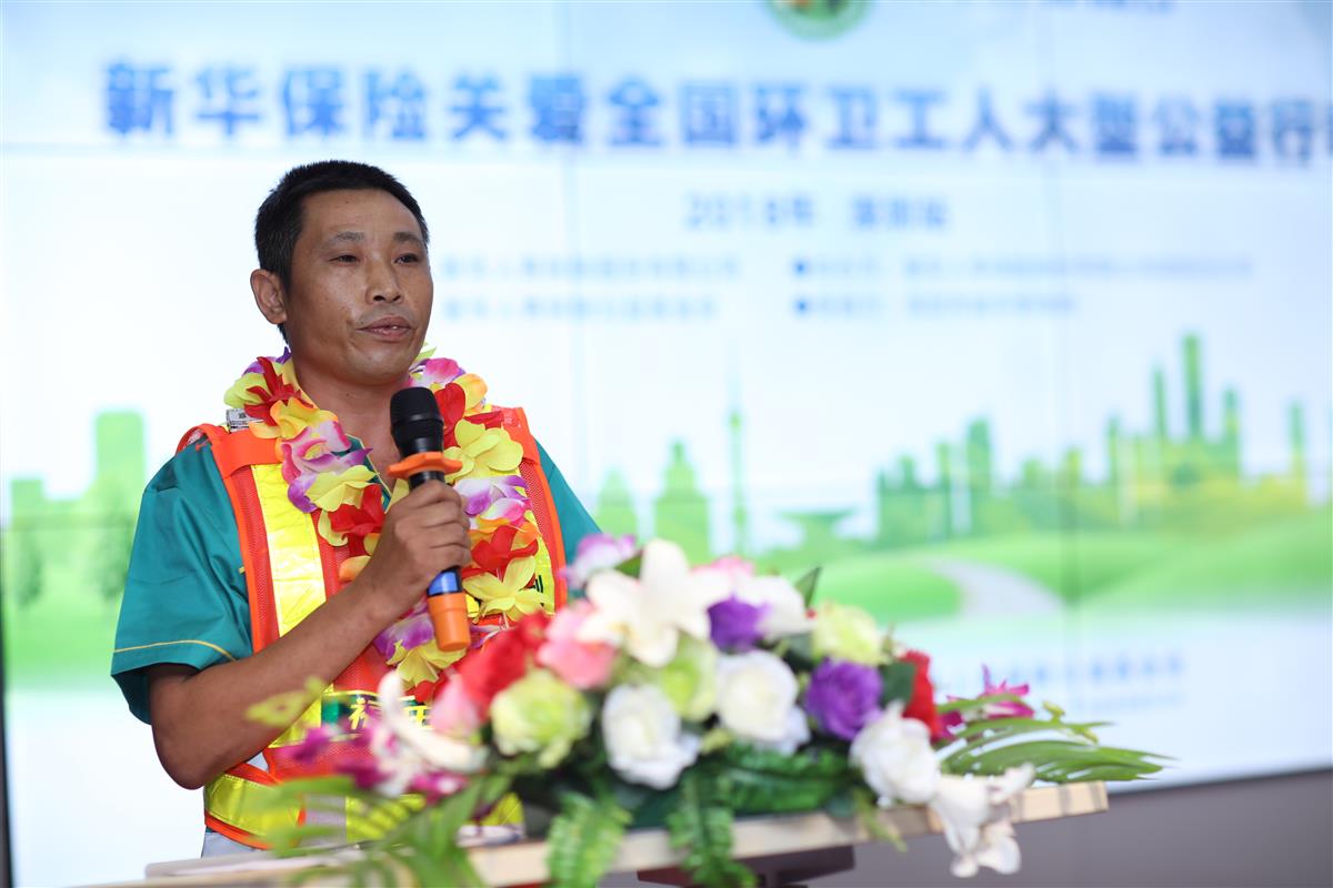 在捐赠仪式上,环卫工人饶天顺作为环卫工人代表对市城管局、新华保险联合开展的这项活动表示感谢。对他们全身心投入工作的同时,多一份保障,感到非常的高兴,非常感谢社会对环卫工人的关心和支持。也将以更积极心态、更勤奋的工作、更优异的成绩来回报关心和帮助我们的社会各界,为城市建设贡献他们的微薄之力。