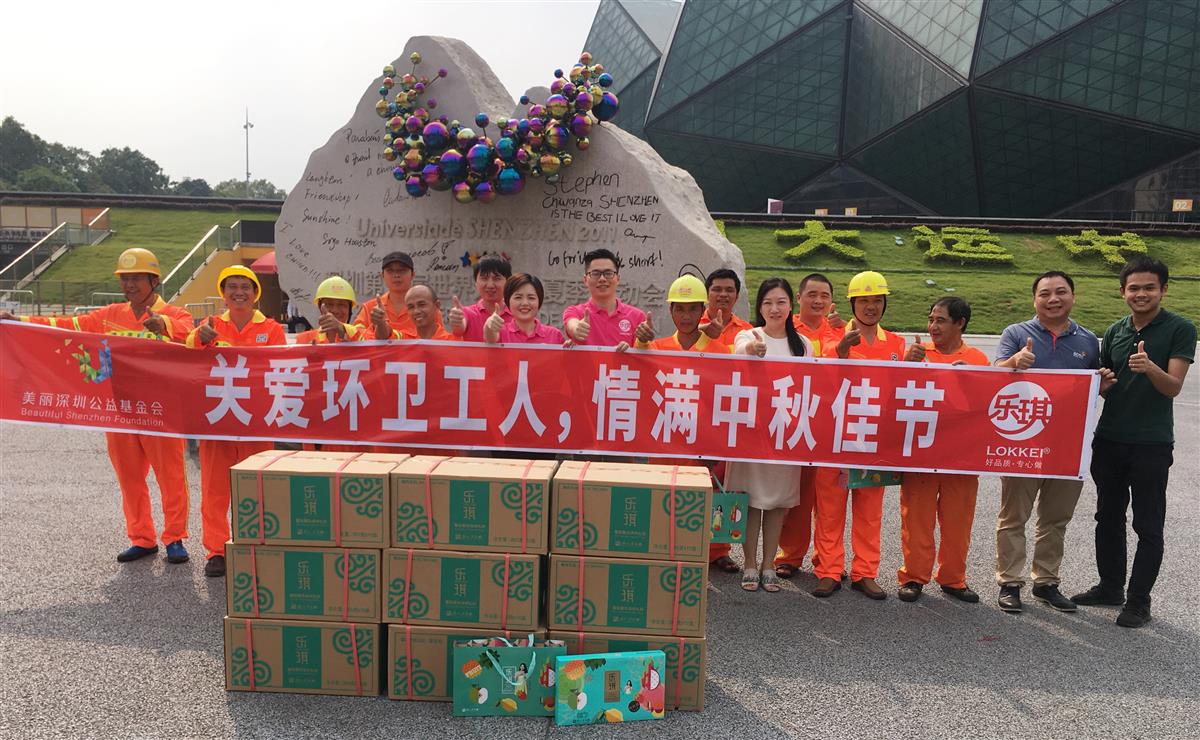 9月20日下午,美丽深圳公益基金会携手深圳市乐琪实业发展有限公司开展“关爱环卫工人·中秋慰问”活动,为龙岗区、宝安区一线环卫工人送上月饼约8000份。
