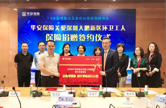 25日下午,在华安保险公司举办“关爱环卫工人意外保险捐赠签约”仪式,华安保险深圳分公司营销总监杜永宁与大鹏城管局副局长曹其捷签署保险合同,向深圳大鹏新区的806名一线环卫工人捐赠一年的团体人身意外伤害保险,总保险保障金额8060万元,用实际行动为辛勤劳动的城市“美容师”筑起坚强后盾。