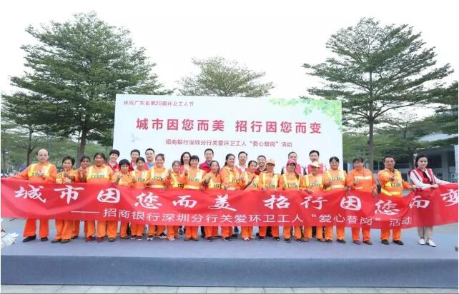 今年环卫工人节上,招商银行深圳分行支持活动50万元,并组织约2000名干部员工在全市6个区77个网点参与“爱心替岗”活动,深刻地感受到环卫工人劳动的艰辛,并向环卫工人捐赠了价值5万元的物资。美丽深圳公益基金会授予招商银行深圳分行“爱心企业”称号。