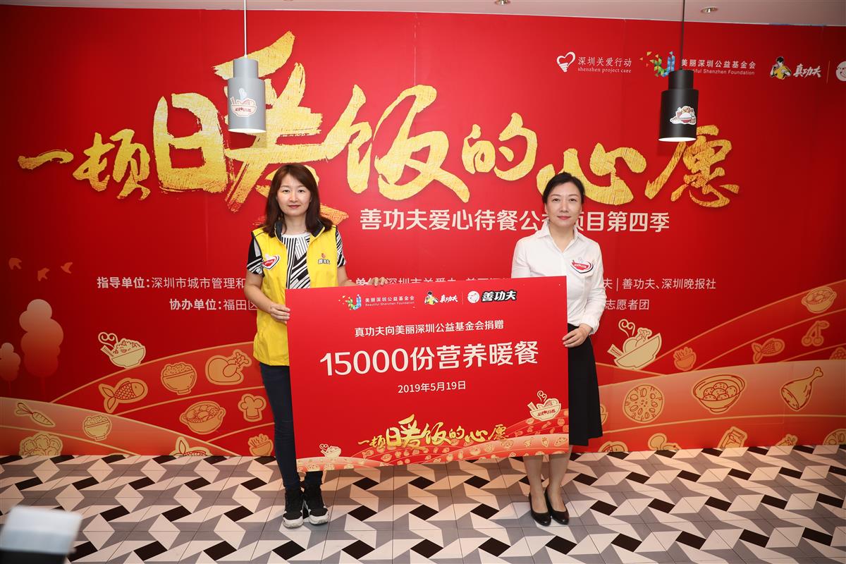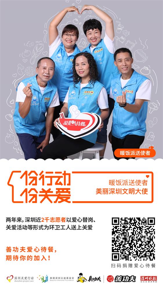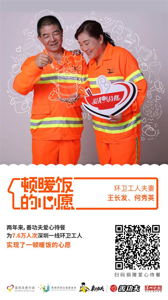 为了表达对环卫工人的敬意与感恩,圆他们一顿暖饭的心愿,2016年,善功夫发起了爱心待餐活动。2017年,深圳市关爱办、美丽深圳 公益基金会、真功夫|善功夫、深圳晚报社策划推出的“爱心待餐”项目上线,在六个月的项目周期内,共发放餐券3.2万份,近2万爱心市民加入这场爱心接力中。2018年5月,第二季“爱心待餐”公益活动得到了更多爱心企业和爱心人士的大力支持,美丽深圳公益基金会理事单位:鹏瑞集团、一体投资集团、华强物业、玉禾田集团、洁亚环保、玉清泉、绿景(中国)负责人担任“暖饭派送大使”。项目上线一个月即完成筹款目标30万元,发放餐券4.4万份,2万余爱心市民参与筹款。2019年5月至10月,深圳市关爱办、美丽深圳公益基金会、深圳报业集团深圳晚报社联合善功夫将继续在深圳地区发起爱心待餐公益活动。
