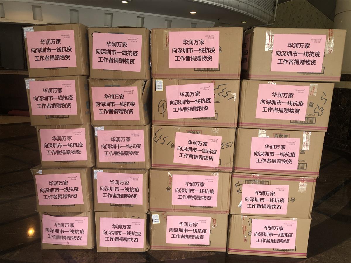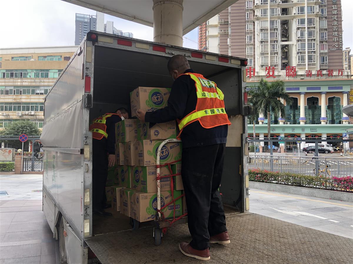 为一线环卫女工代表送上来自爱心企业华润万家、达能脉动捐赠的500箱运动饮料和500罐坚果,