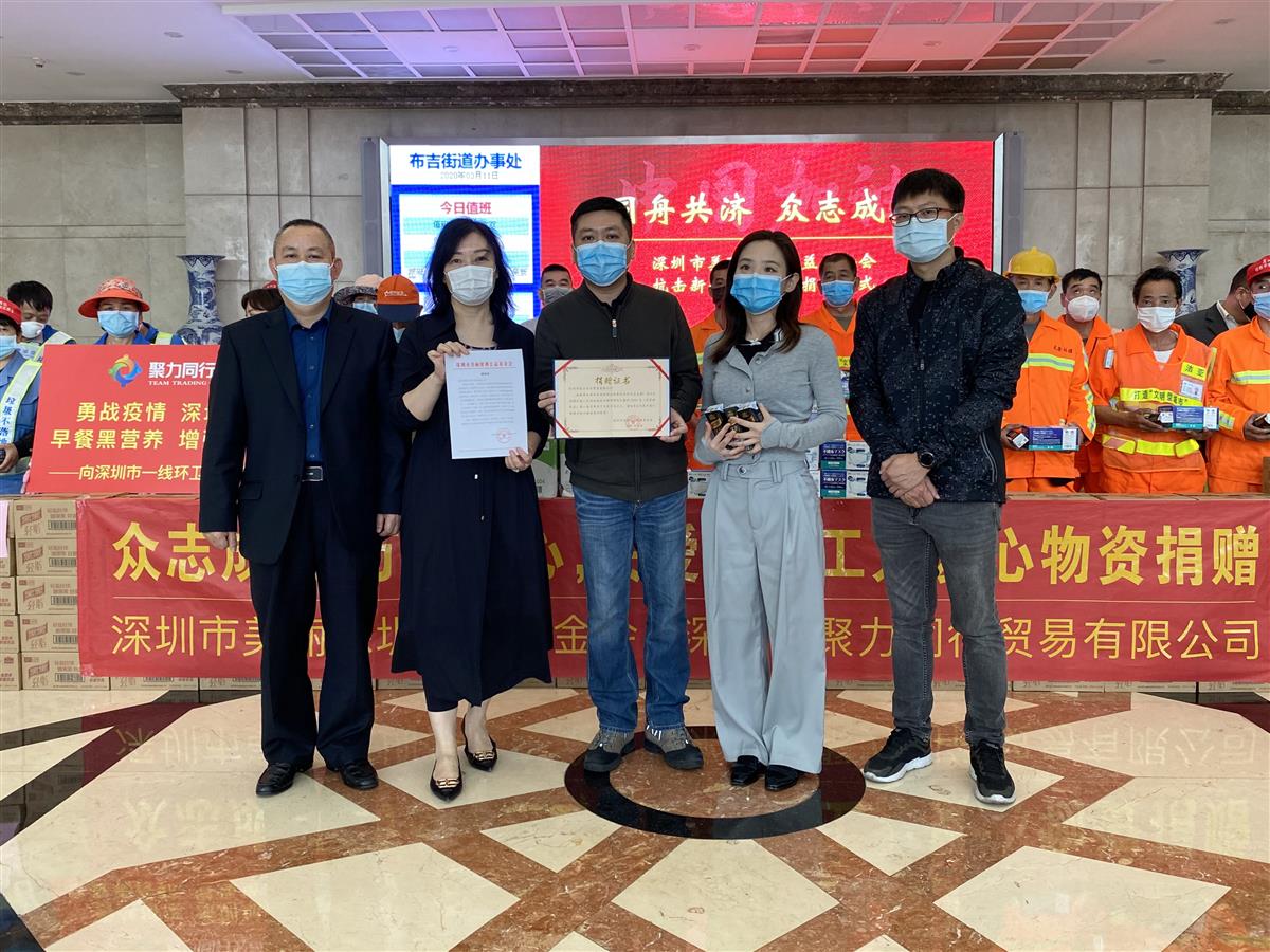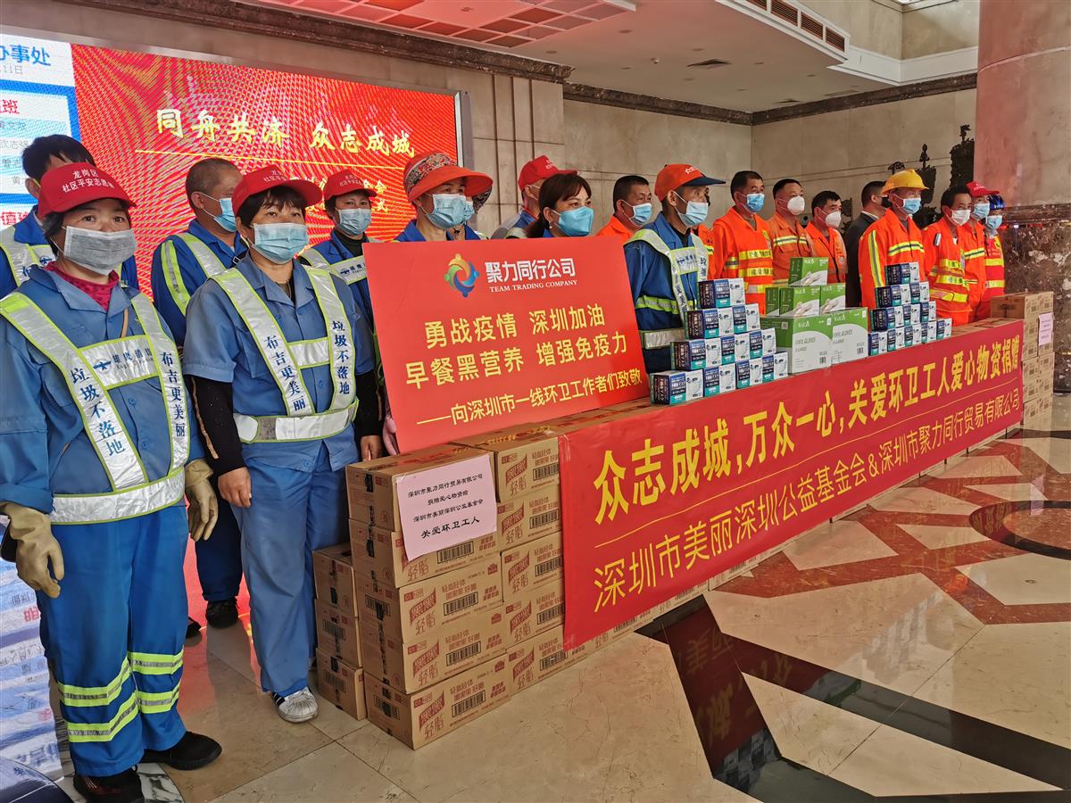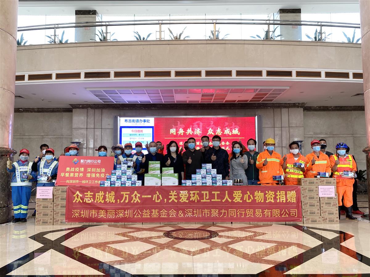 3月12日,美丽深圳公益基金会联合深圳市聚力同行贸易有限公司在布吉街道开展慰问环卫工人活动,美丽深圳公益基金会秘书长张晓玮、深圳市聚力有限公司总经理杨果、布吉街道执法队队长王朝华等一行慰问了在疫情防控期间坚守一线的20名环卫工人代表,分别为环卫工人们送上3600只一次性医用口罩、1000双橡胶手套和800箱黑芝麻饮品。