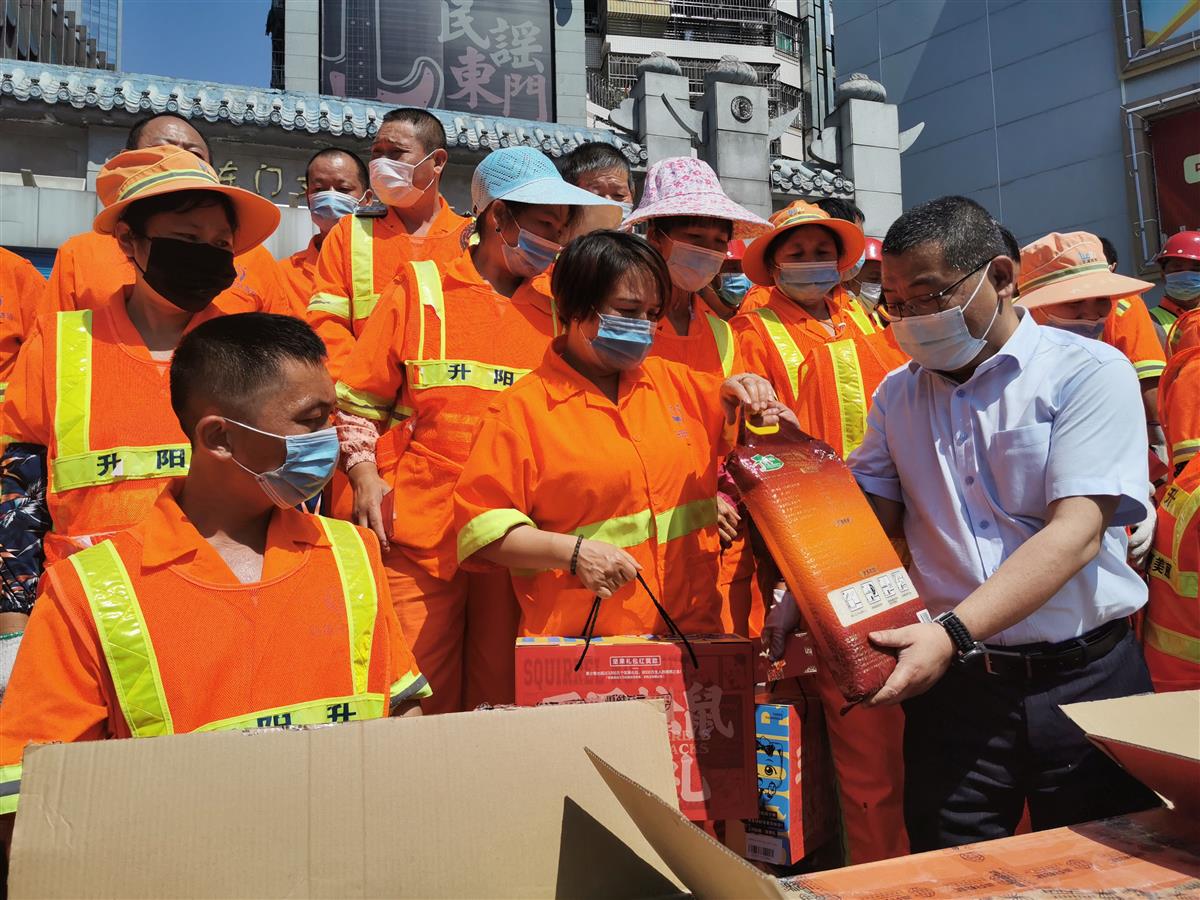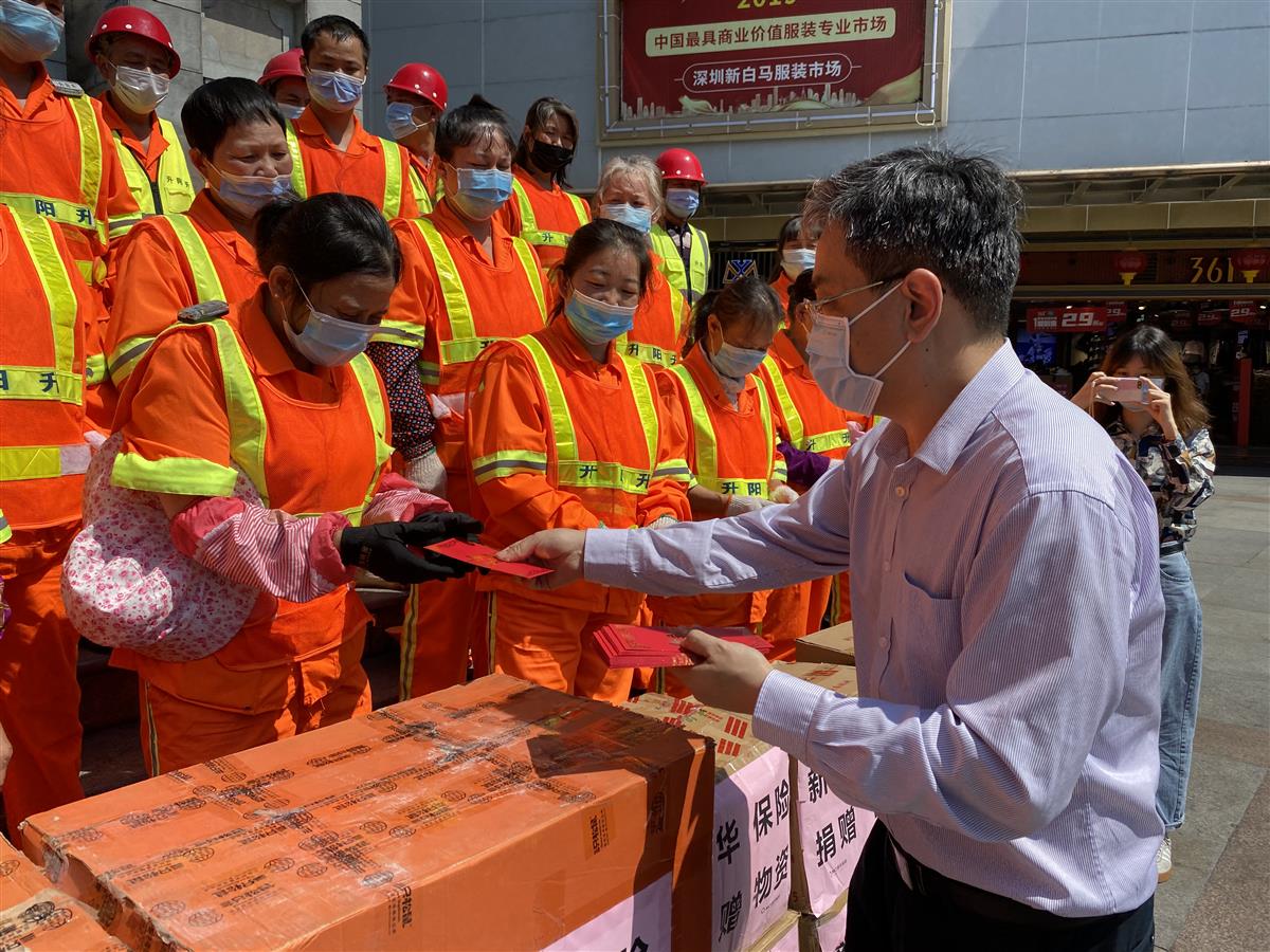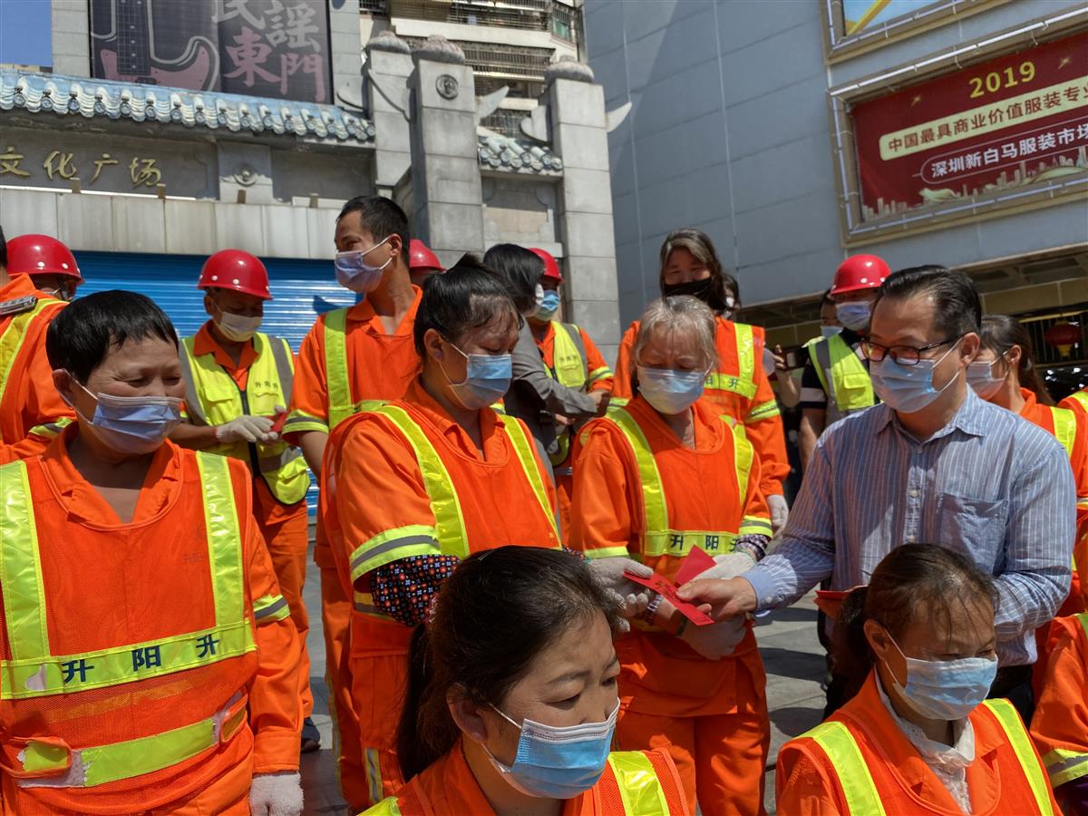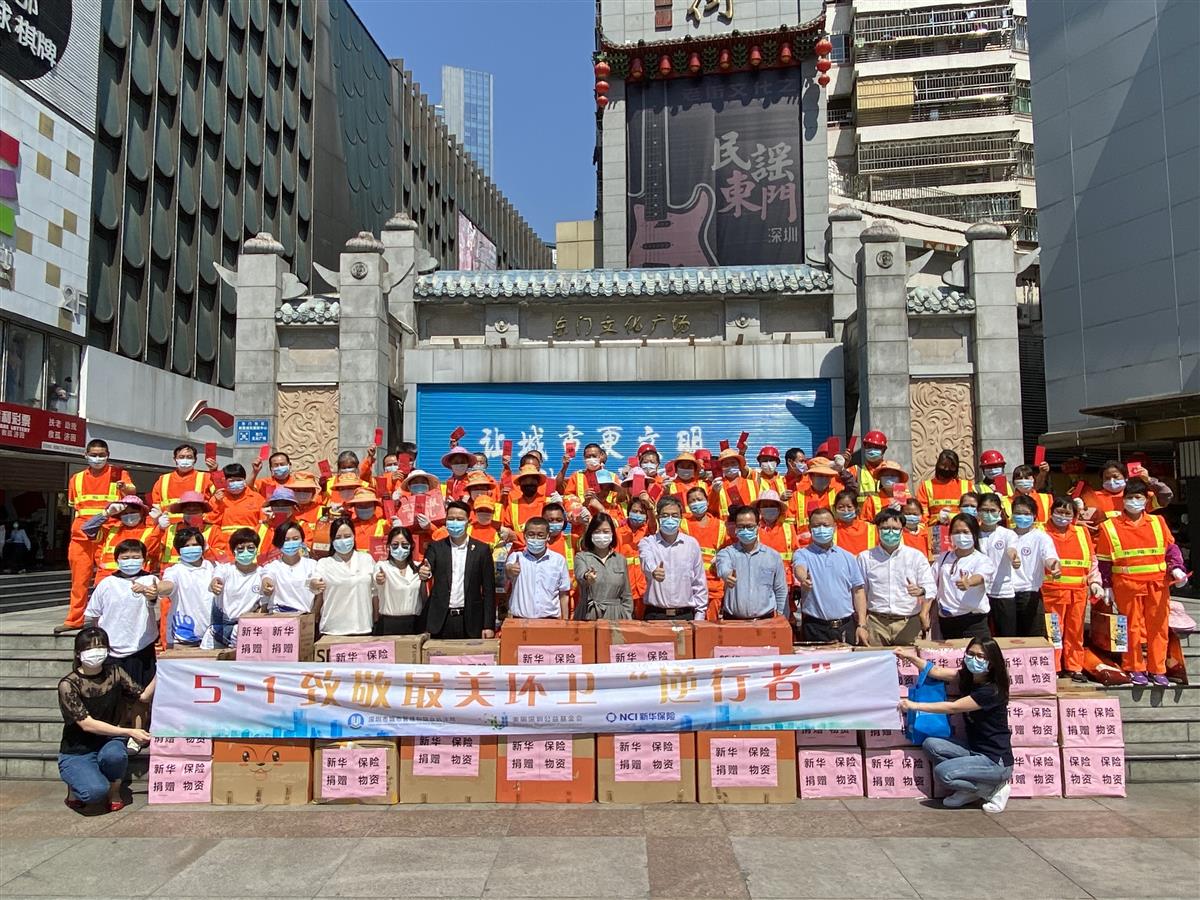 4月28日下午,在“五一”国际劳动节即将来临之际,市城管和综合执法局联合美丽深圳公益基金会、新华人寿保险股份有限公司深圳分公司(以下简称“新华保险”)在罗湖东门步行街白马广场共同开展“美丽深圳·阳光行动”|5·1 致敬最美环卫“逆行者”活动,感谢一线环卫工人在疫情防控期间的辛苦付出。