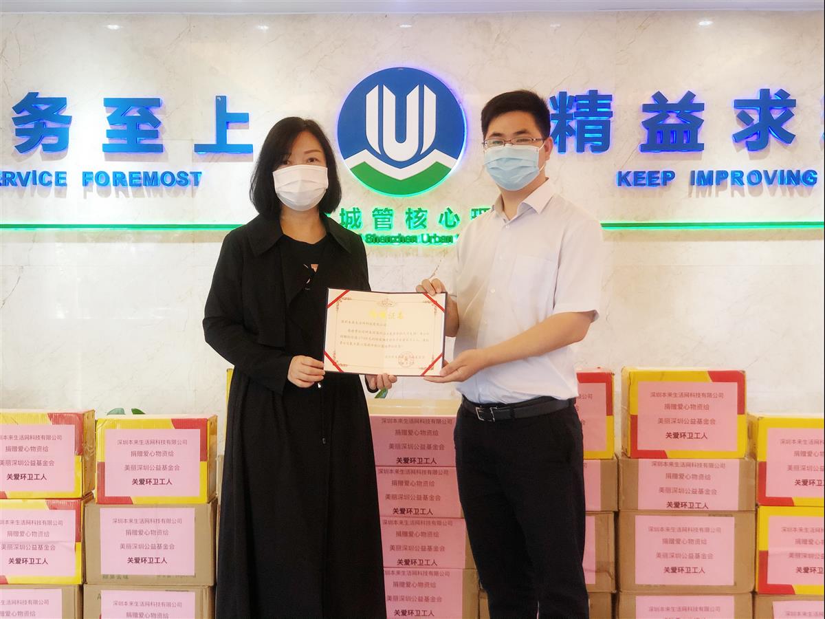 张晓玮秘书长向深圳本来生活网颁发了捐赠证书并表示由衷的感谢,感谢他们为环卫工人提供力所能及的帮助,助力环卫工人为学校复学复课提供环境卫生保障。