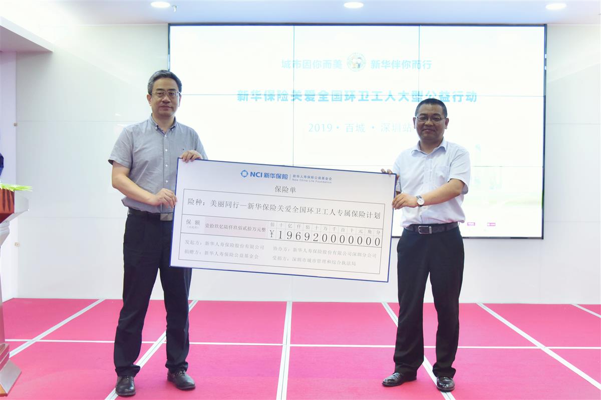 新华人寿保险公益基金会累计为我市福田、罗湖、盐田、南山以及龙华五个区累计59364名一线环卫工人每人赠送10万元保额的意外伤害保险,合计捐赠保额59.364亿元人民币。希望为环卫工人筑起一道安全屏障,减少他们的后顾之忧。