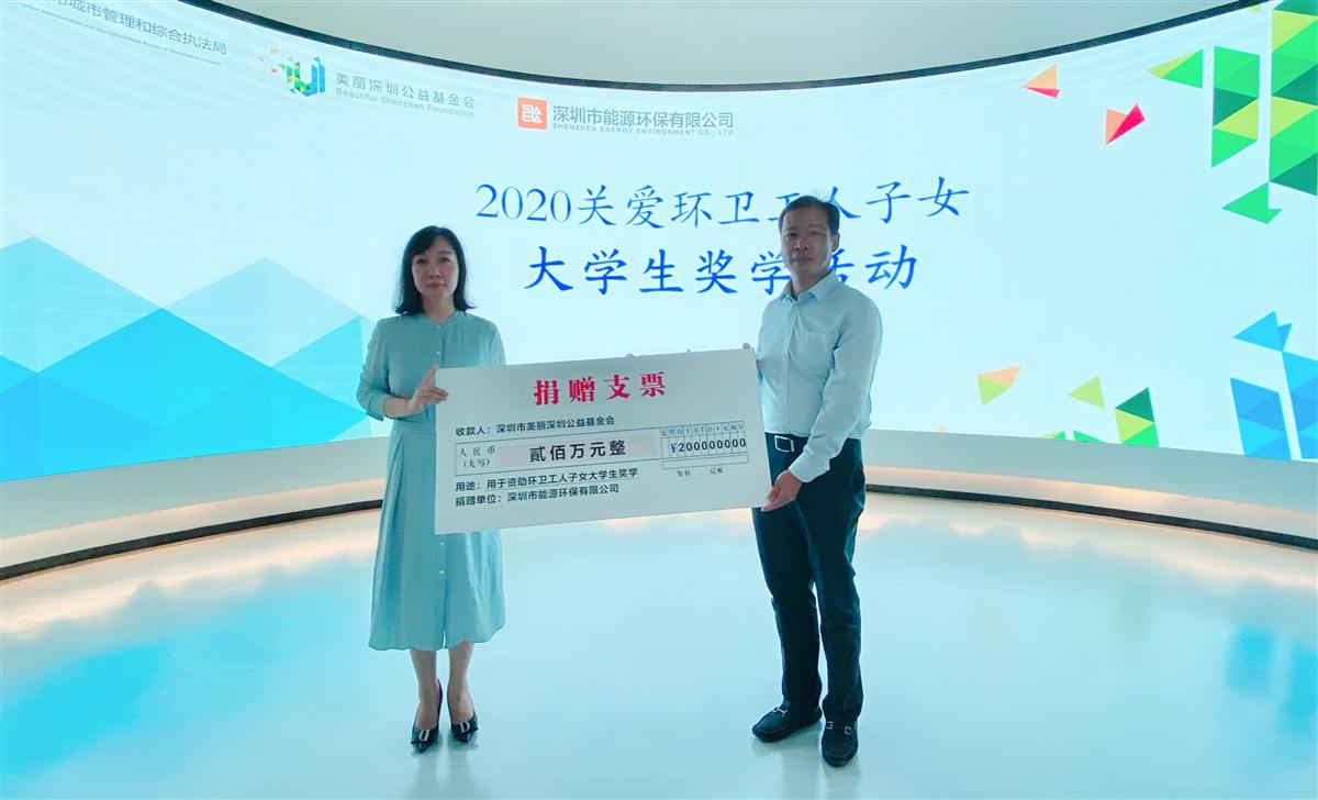 活动仪式上,深圳市能源环保有限公司向美丽深圳公益基金会捐款200万元,设立“美丽深圳·深能环保大学生奖学金”,帮助有需要的环卫工人家庭减轻教育负担。