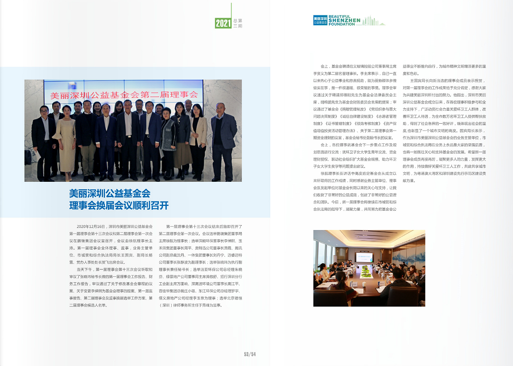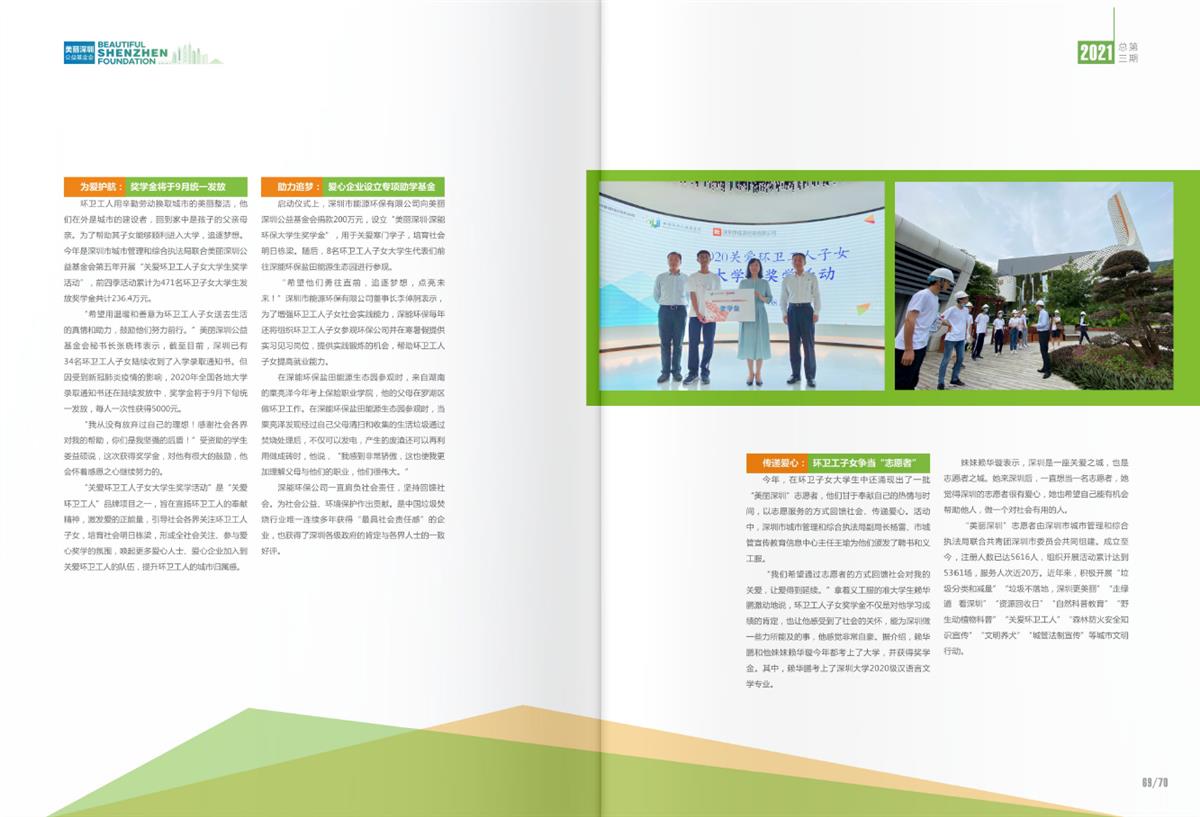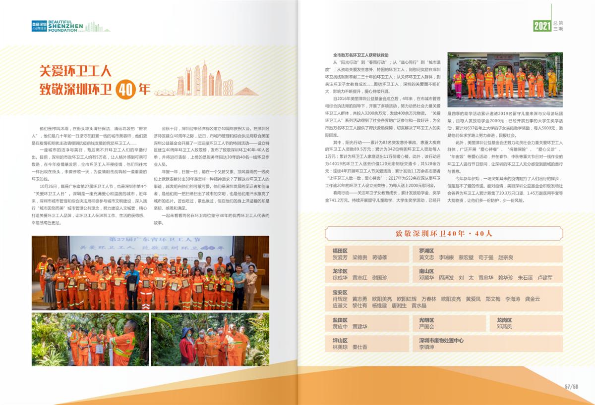 《美丽深圳公益基金会》总第三期年报已出刊,记载和反映了基金会2020年的工作情况和公益项目。感谢社会各界对关爱环卫工人项目的支持和参与。如有需求,请与秘书处联系。欢迎关注!