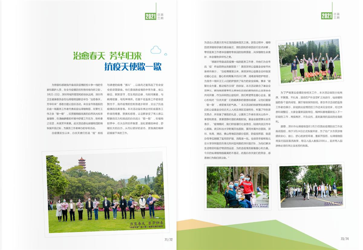 3月21-22日,深圳市城市管理和综合执法局、深圳市卫生健康委员会在仙湖植物园联合举办、深圳市中国科学院仙湖植物园和美丽深圳公益基金会承办“治愈春天,芳华归来”感恩主题公益日活动,邀请全市各医院的抗疫一线医务工作者代表游览仙湖植物园,感谢他们为全市战‘疫’作出的突出贡献,让他们在繁忙工作之余“歇一歇”。