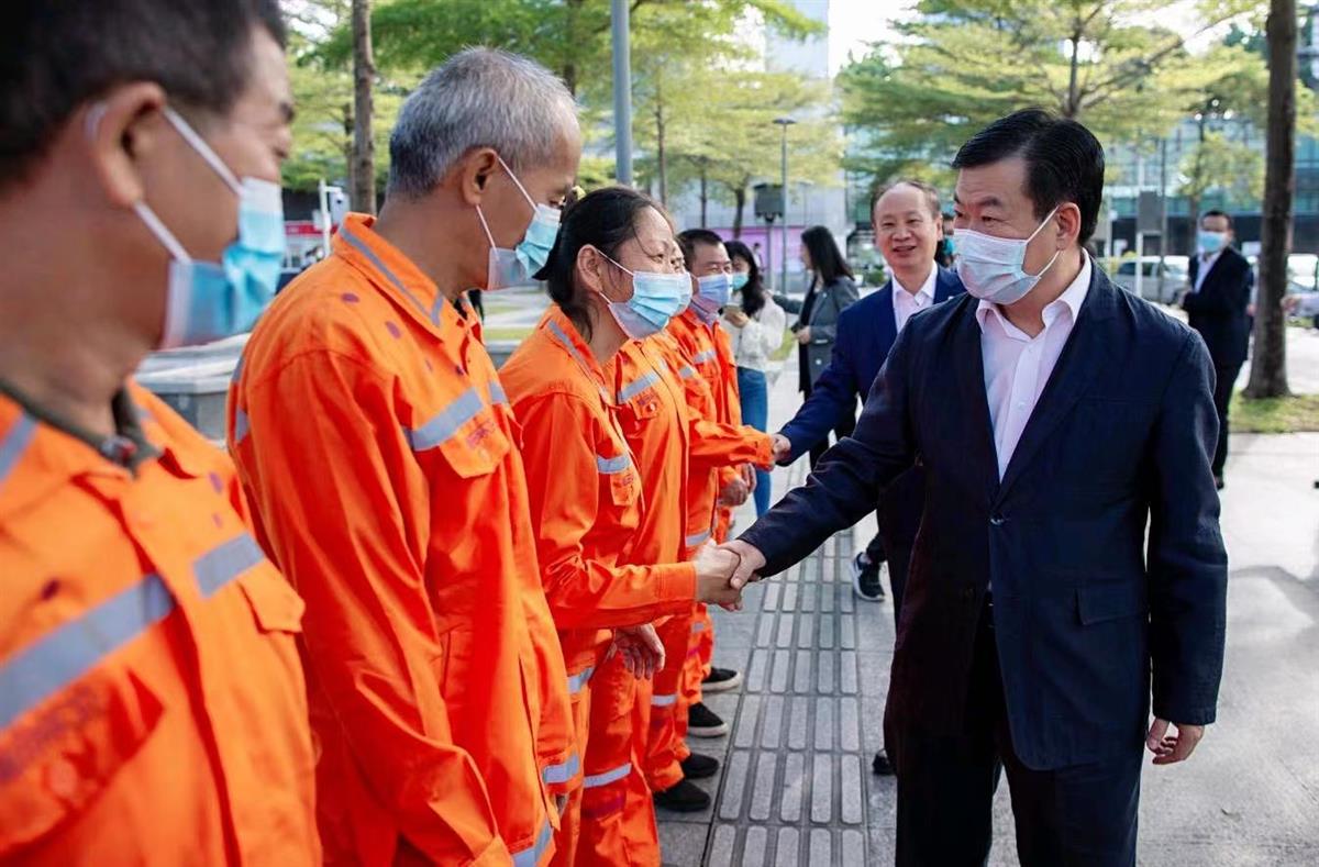 10月26日上午,市委常委、常务副市长黄敏,市城管和综合执法局局长张国宏,市城管和综合执法局党组成员、二级巡视员邝龙桂,美丽深圳公益基金会理事长、深圳鹏瑞集团有限公司董事局主席徐航等一行来到中心书城北广场慰问了在福田区市民中心片区作业的一线环卫作业班组,为所在班组的环卫工人代表每人送上1000元节日慰问金,感谢他们创造的干净整洁的美好城市环境。