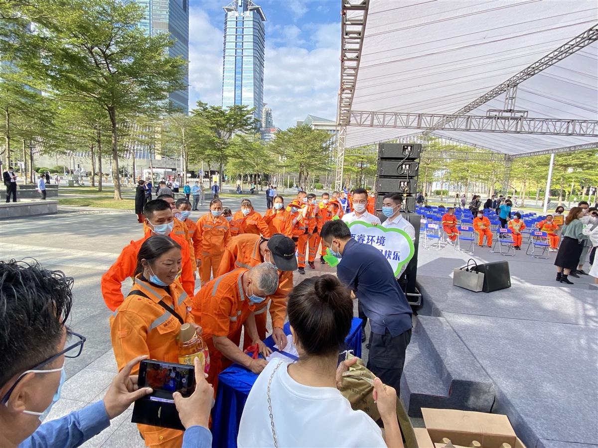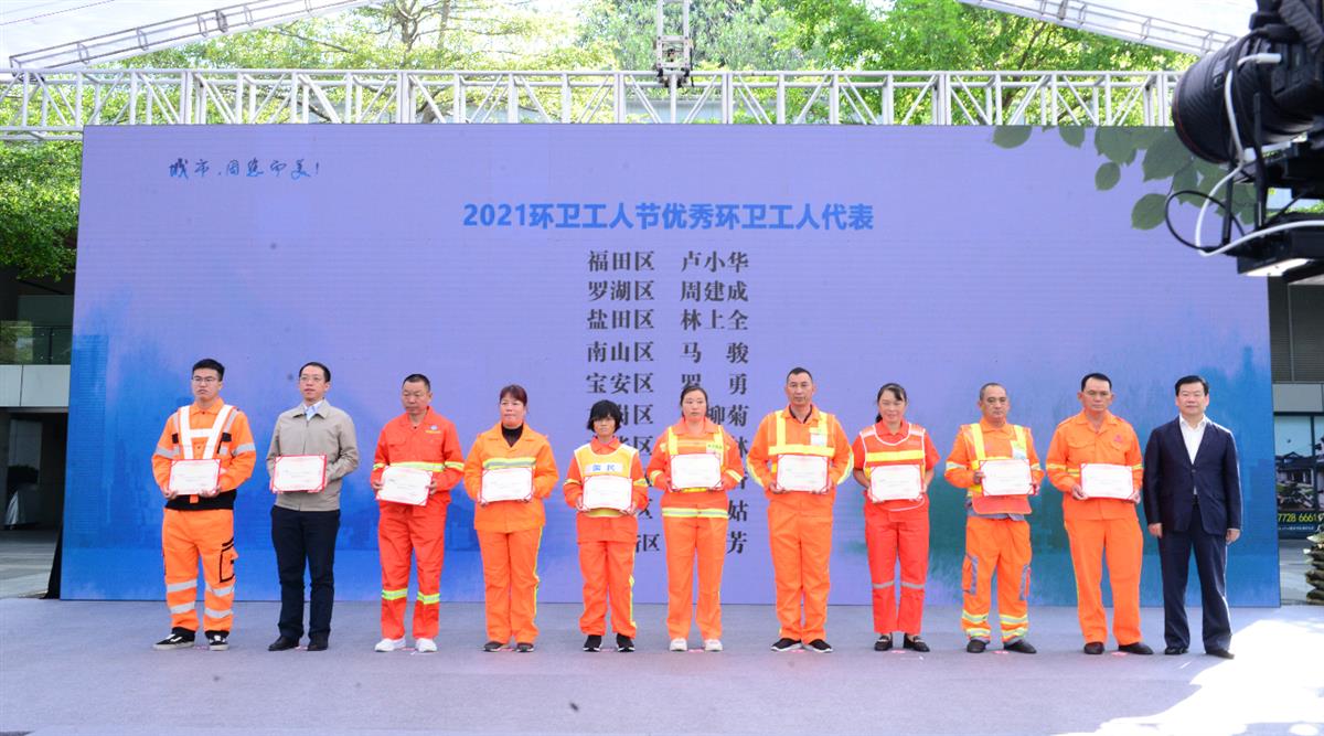 节日当天,市城管和综合执法局还联合美丽深圳公益基金会对全市从事一线环卫工作累计时长超过5周年的1000名优秀环卫工人进行表彰,每人发放慰问金1000元。50名环卫工人代表参加了活动,现场为10名优秀环卫工人代表颁发荣誉证书。