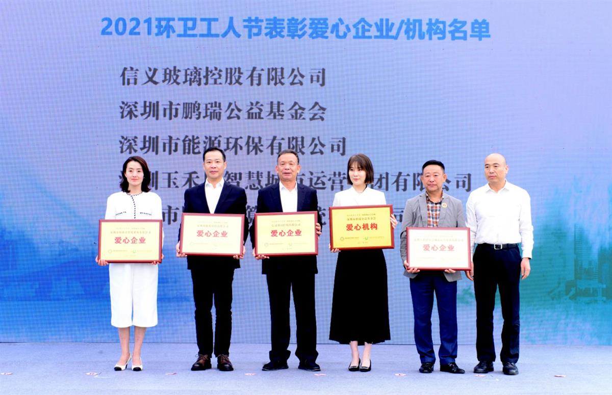 鹏瑞集团是爱心企业代表之一。近年来,在关爱环卫工人的公益道路上,深圳涌现出一大批热心公益、甘于奉献的爱心企业,通过捐钱捐物等方式为环卫工人送温暖、献爱心。为了感谢他们长期以来对环卫工人的支持与关怀,此次活动对2021年度的爱心企业代表进行了表彰。他们分别是:信义玻璃控股有限公司、深圳市鹏瑞公益基金会、深圳市能源环保有限公司、深圳玉禾田智慧城市运营集团有限公司 、深圳市腾讯计算机系统有限公司、深圳市迈睿迈特环境科技有限公司、深圳市洁亚环保产业有限公司、绿景(中国)地产投资有限公司、招商银行股份有限公司深圳分行、深圳高速环境有限公司、东江环保股份有限公司、中国联合网络通信有限公司深圳市分公司、新华人寿保险股份有限公司深圳分公司、中国太平洋财产保险股份有限公司深圳分公司、星巴克咖啡(深圳)有限公司、深圳市爱阅公益基金会、深圳希玛林顺潮眼科医院。