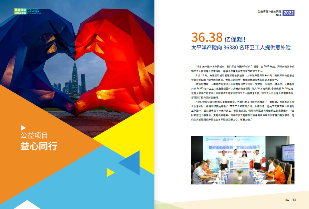 由市城管和综合执法局、太平洋产险深圳分公司、基金会联合发起“城市因您而美,太保与您同行”意外险赞助仪式在深业上城举行。太平洋产险向深圳市龙岗区、宝安区、光明区、坪山区、大鹏新区共计36380名环卫工人免费提供团体人身意外伤害保险,每人10万元保额,合计保额36.38亿元。