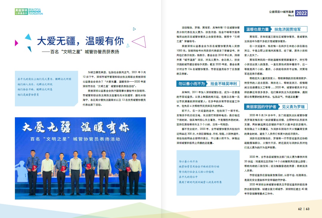 市城管和综合执法局联合基金会举办了“大爱无疆、温暖有你——2020年度深圳市百名‘文明之星’城管协管员表扬活动”。基金会为百名在见义勇为、扶危济困、拾金不昧等方面表现突出的城管协管员每人奖励1000元。