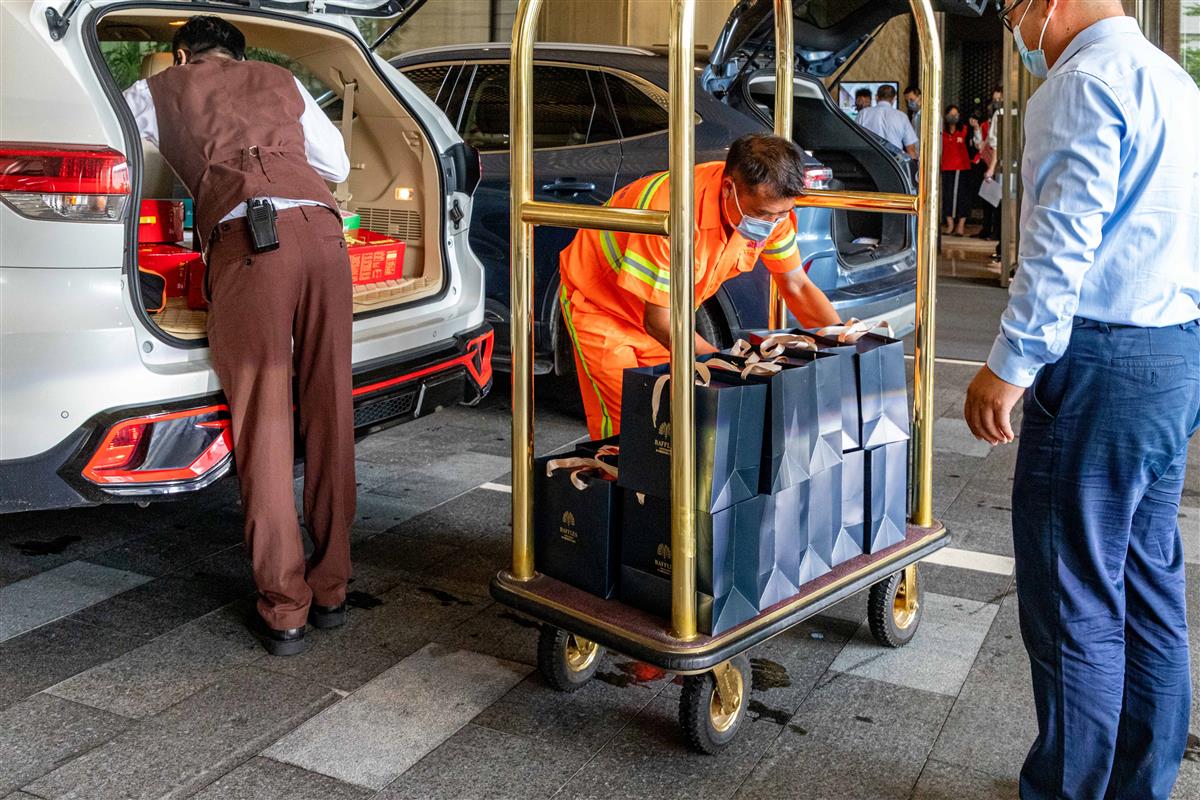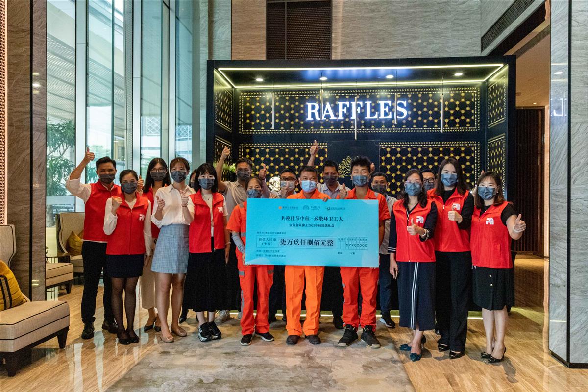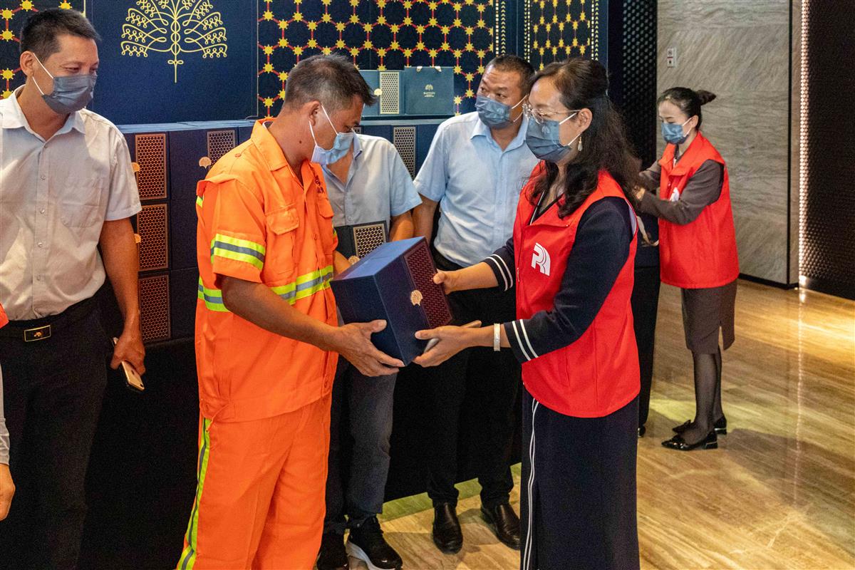 深圳鹏瑞莱佛士酒店业主代表李春红女士及酒店总经理黄礼邦先生与鹏瑞公益基金会代表以及美丽深圳公益基金会代表,共同向三位环卫工人代表捐赠了价值约8万元人民币的莱佛士中秋臻选礼盒。寓情于礼,以酒店匠心制作的颂月之选,与维护美丽深圳的辛勤劳动者们分享月盈湾畔的美好时刻。