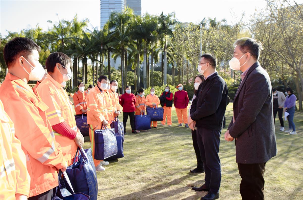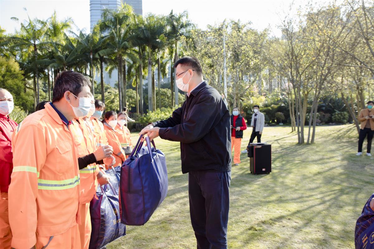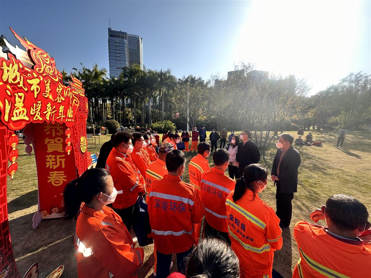 市城管和综合执法局副局长黄立新,市环卫处党委副书记袁宏伟,美丽深圳公益基金会执行副理事长、秘书长张晓玮参加了活动,为环卫工人代表送上了新年慰问礼包。