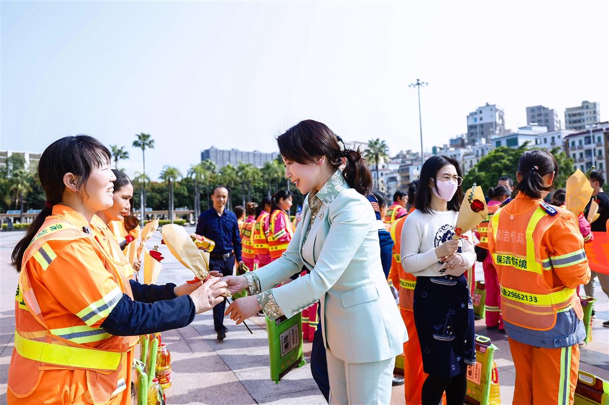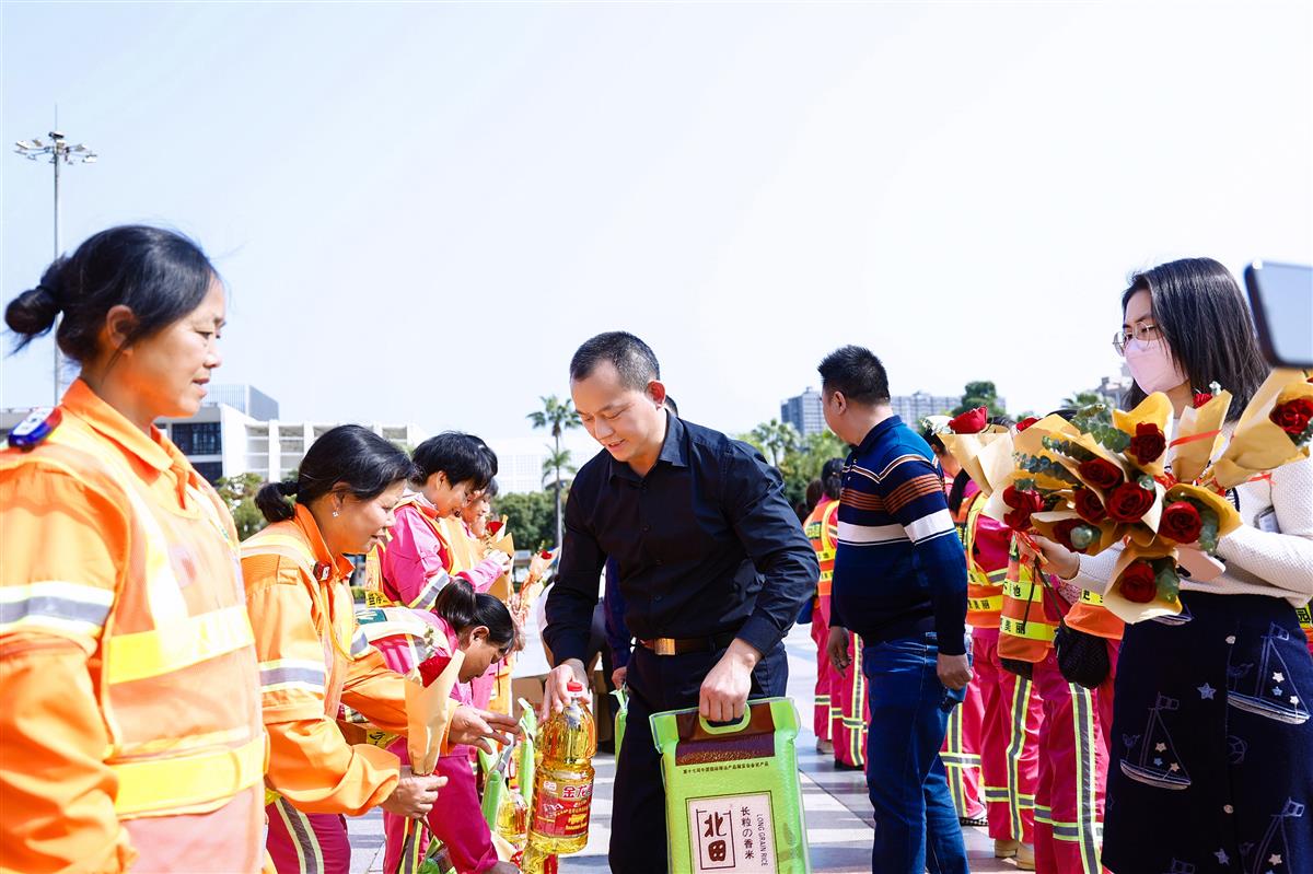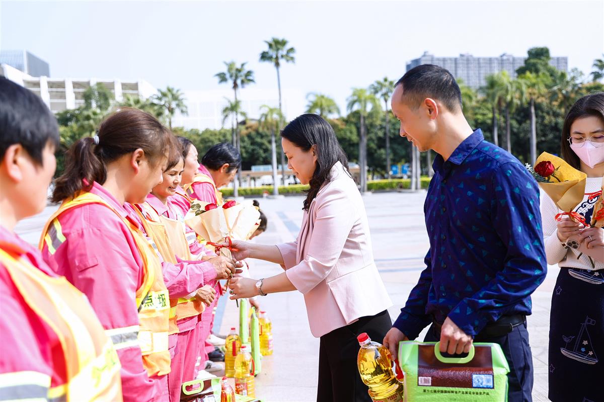 市环卫处副处长徐晓帆、龙华区城市管理和综合执法局副局长余国强,美丽深圳公益基金会副理事长、迈睿环境公司董事长张静波,基金会执行副理事长兼秘书长张晓玮出席活动,并为30名环卫女工代表送上慰问粮油和玫瑰花。