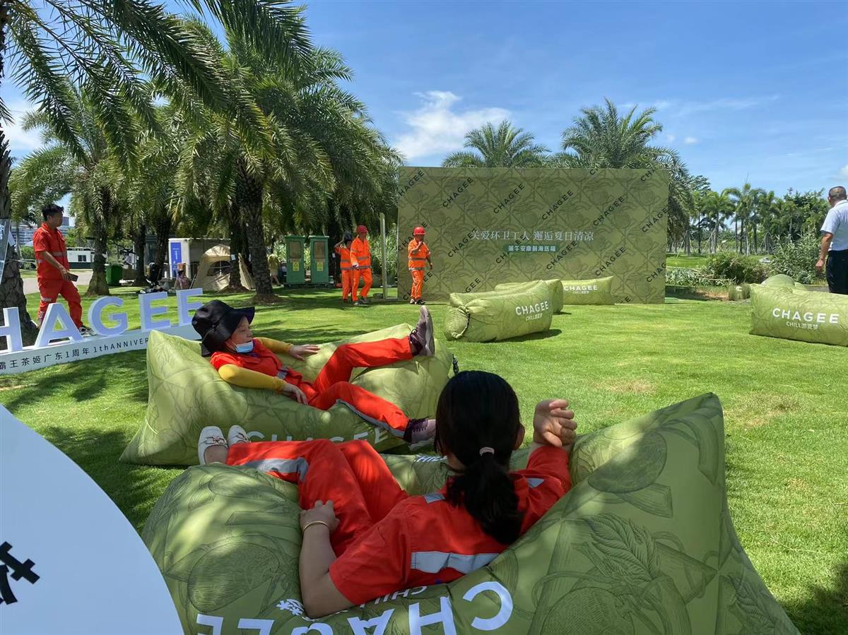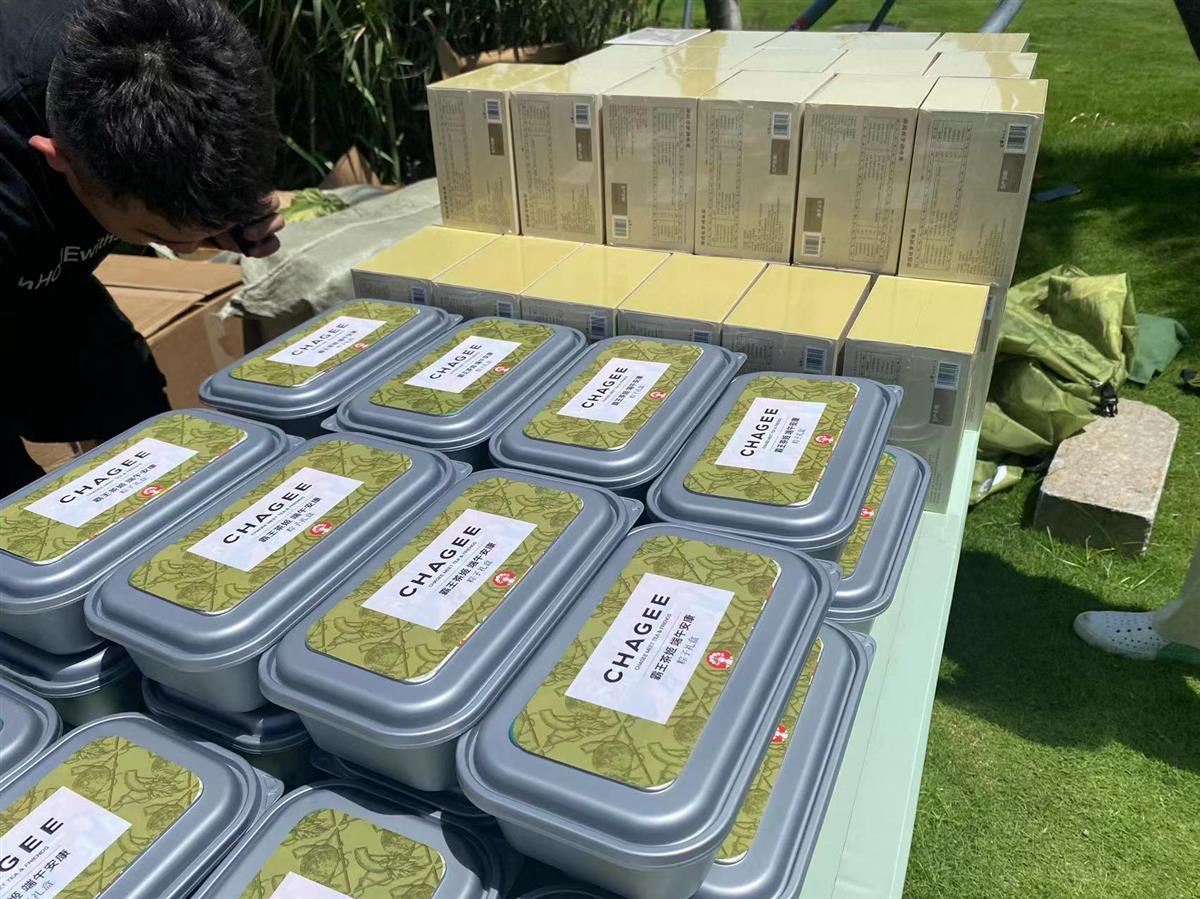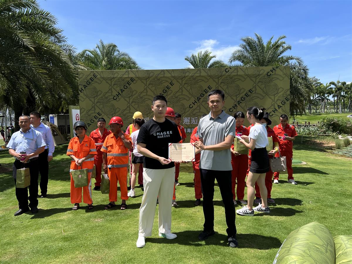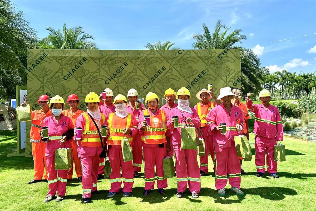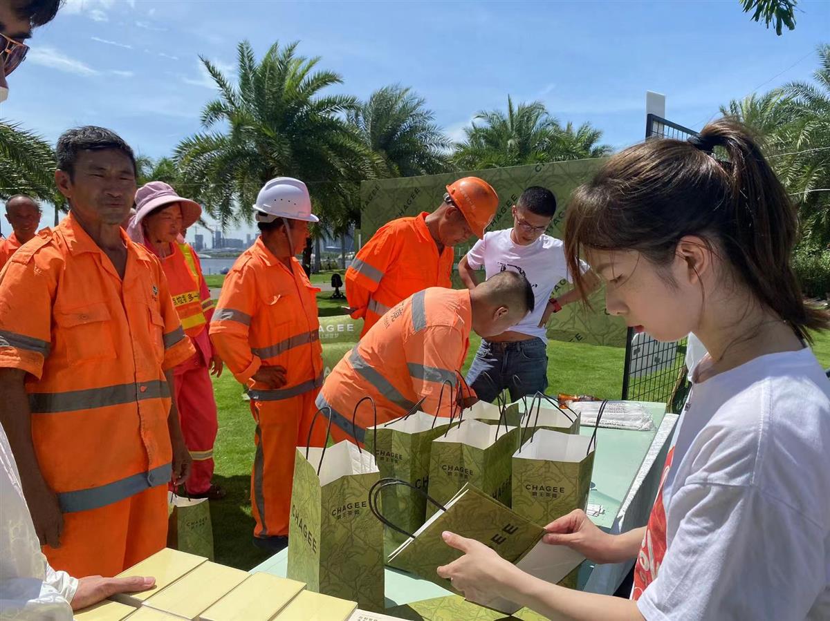 6月22日,在深圳前海演艺公园,上百份端午祝福已“整装待发”。基金会与霸王茶姬工作人员一同向附近辛勤工作的深圳环卫工人,送上首日祝福礼品和清凉饮品。本次公益行动将持续至6月24日,共计将为300位环卫工人送上节日祝福与夏日慰问。