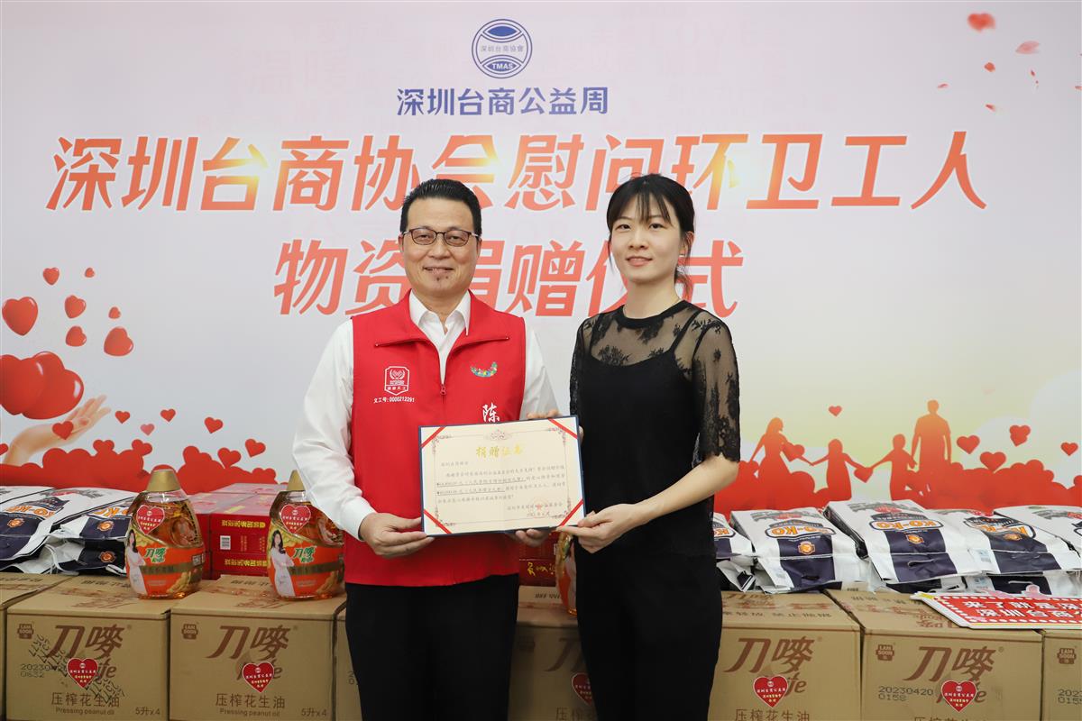 活动上,美丽深圳公益基金会常青副秘书长向台商协会陈忠和会长颁发捐赠证书。陈忠和会长、游淑燕常务副会长还代表协会给环卫工人致赠了红包。
