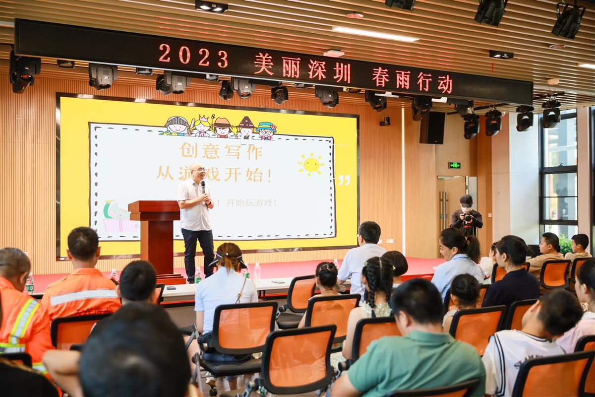 活动邀请了深圳广电集团交通广播新闻部主任孙立遐(笔名四虎)为环卫子女们作阅读分享。四虎老师以《创意写作,由游戏开始》为主题,引导孩子们从游戏中学会想象和表达,现场小朋友们反响强烈,掌声不断。四虎老师还鼓励环卫工人子女要将阅读作为一种生活方式,学会享受阅读和创作带来的快乐。