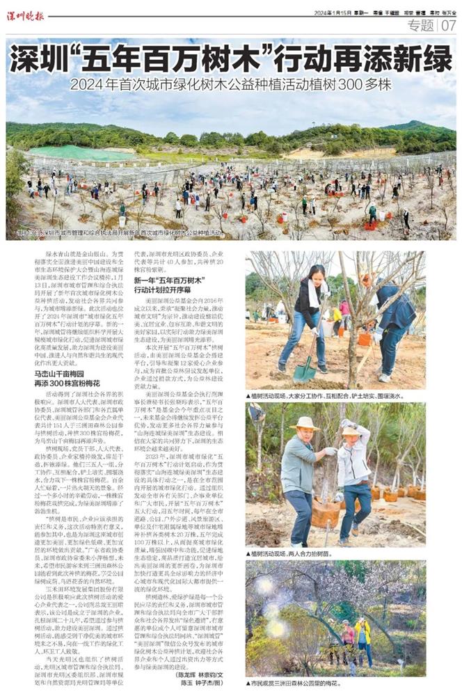1月13日,深圳市城市管理和综合执法局举办新年首次城市绿化树木公益种植活动,拉开了2024年深圳市“城市绿化五年百万树木”行动计划的序幕。