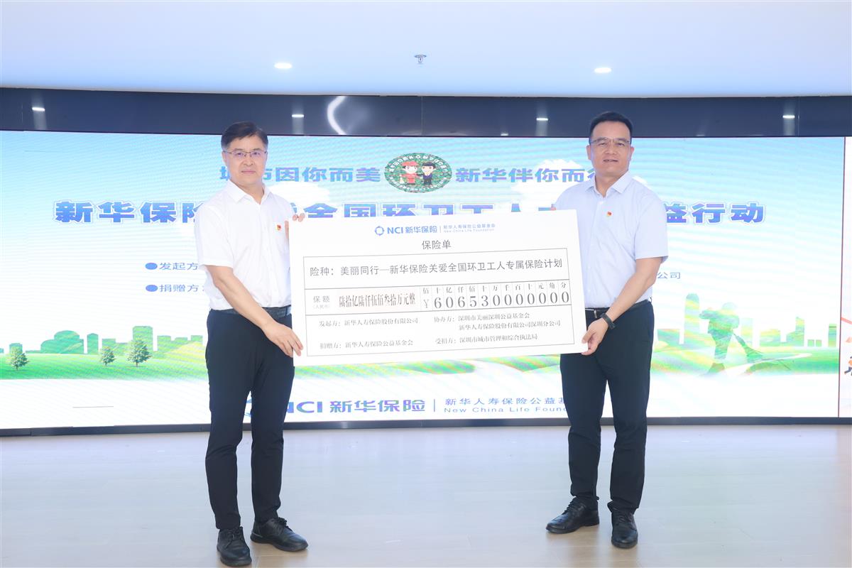 2024年,新华保险聚焦金融“五篇大文章”,积极服务国家战略,持续推动普惠金融走深走实,不断扩大关爱环卫工人项目的覆盖范围,于今年首次实现深圳市环卫工人全覆盖,为深圳市全市60653名环卫工人捐赠每人10万元保额的意外伤害保险,保额合计60.653亿元。同时,为进一步助力乡村振兴、开展消费帮扶,在本次活动中,新华保险深圳分公司还向环卫工人们送上50件助农爱心物资,切实解决环卫工人实际生活需要。