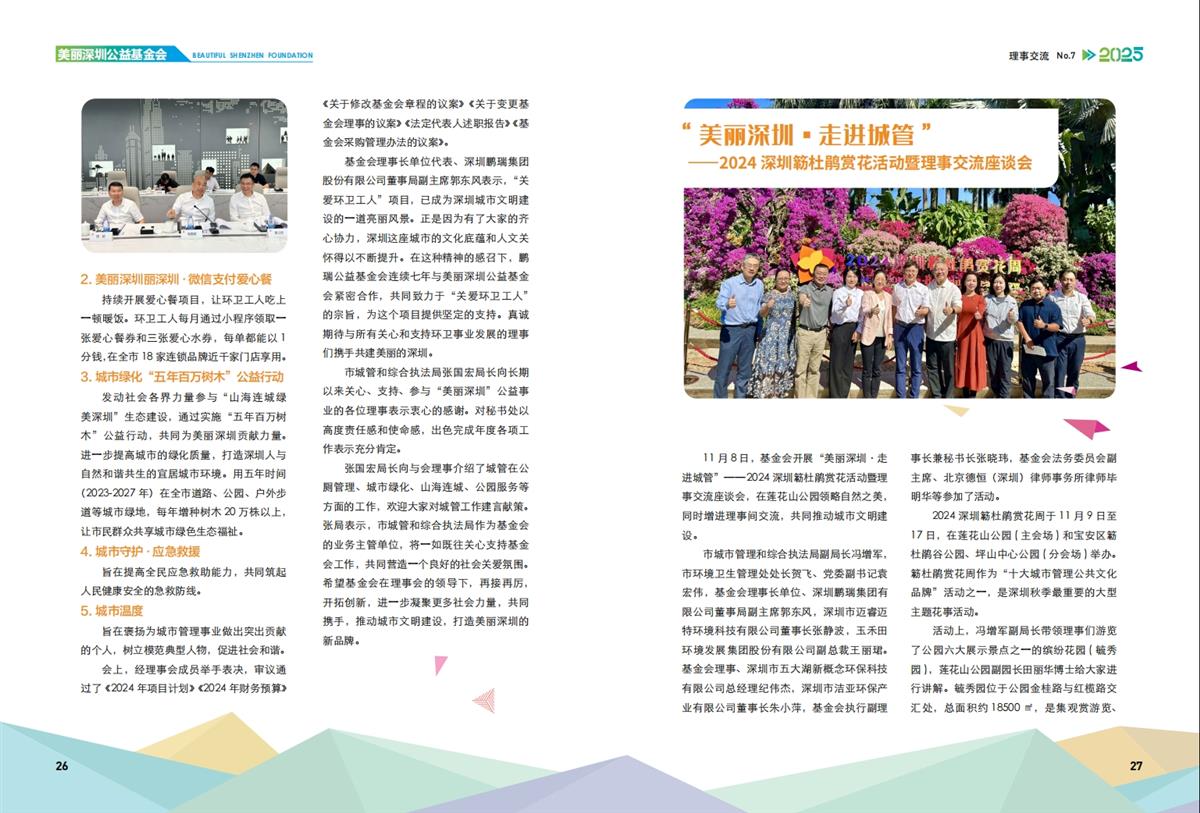 11月8日,基金会开展“美丽深圳·走进城管”--2024深圳簕杜鹃赏花活动暨理事交流座谈会,在莲花山公园领略自然之美,同时增进理事间交流,共同推动城市文明建设。活动上,理事们游览了公园六大展示景点之一的缤纷花园(毓秀园)。随后,大家移步紫陌书吧进行交流座谈。
