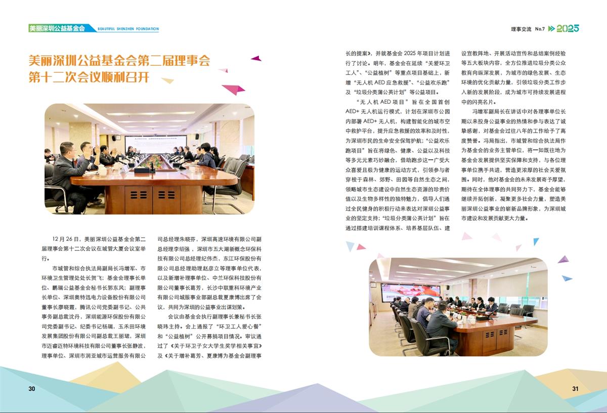 12月26日,基金会第二届理事会第十二次会议在城管大厦会议室举行。会上通报了“环卫工人爱心餐”和“公益植树”公开募捐项目情况。审议通过了《关于环卫子女大学生奖学相关事宜》及《关于增补葛芳、夏康博为基金会副理事长的提案》并就基金会2025年项目计划进行了讨论。