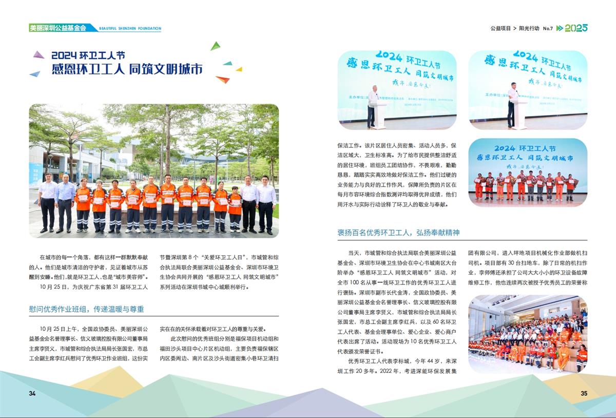 10月25日,为庆祝广东省第31届环卫工人节暨深圳第8个“关爱环卫工人日”,市城管和综合执法局联合基金会、市环境卫生协会共同在深圳书城中心城开展“感恩环卫工人 同筑文明城市”系列活动,慰问了优秀环卫作业班组和对全市100名从事一线环卫工作的优秀环卫工人进行褒扬。活动现场为10名优秀环卫工人代表颁发荣誉证书,为2024年度最具贡献的爱心企业、商户颁发了爱心企业牌匾,感谢他们以实际行动为关爱环卫工人事业贡献力量。