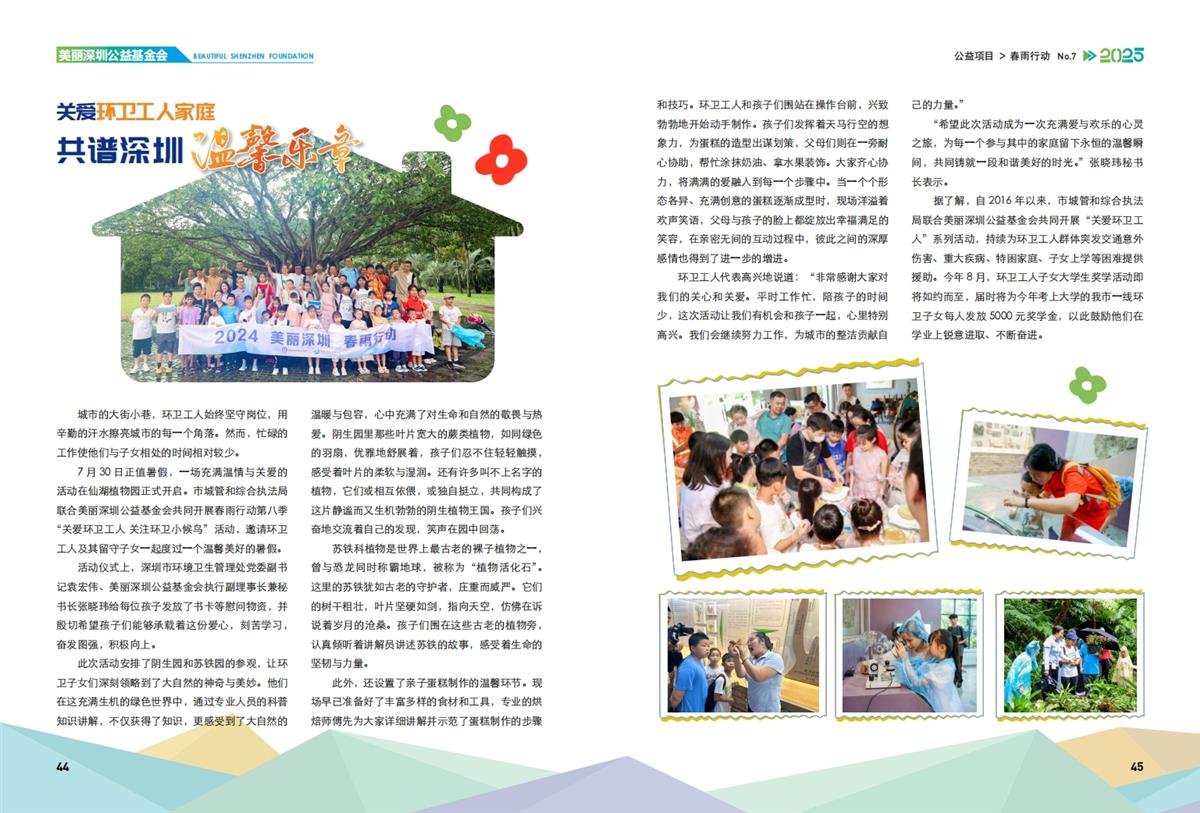 7月30日,市城管和综合执法局联合基金会开展第八季“关爱环卫工人 关注环卫小候鸟”活动,组织环卫工人与其子女参观仙湖植物园、制作亲子蛋糕等,还为他们送上书卡等慰问品。该活动让环卫子女们领略了大自然的神奇与美妙,也进一步的增进环卫工人与子女彼此之间的深厚感情。