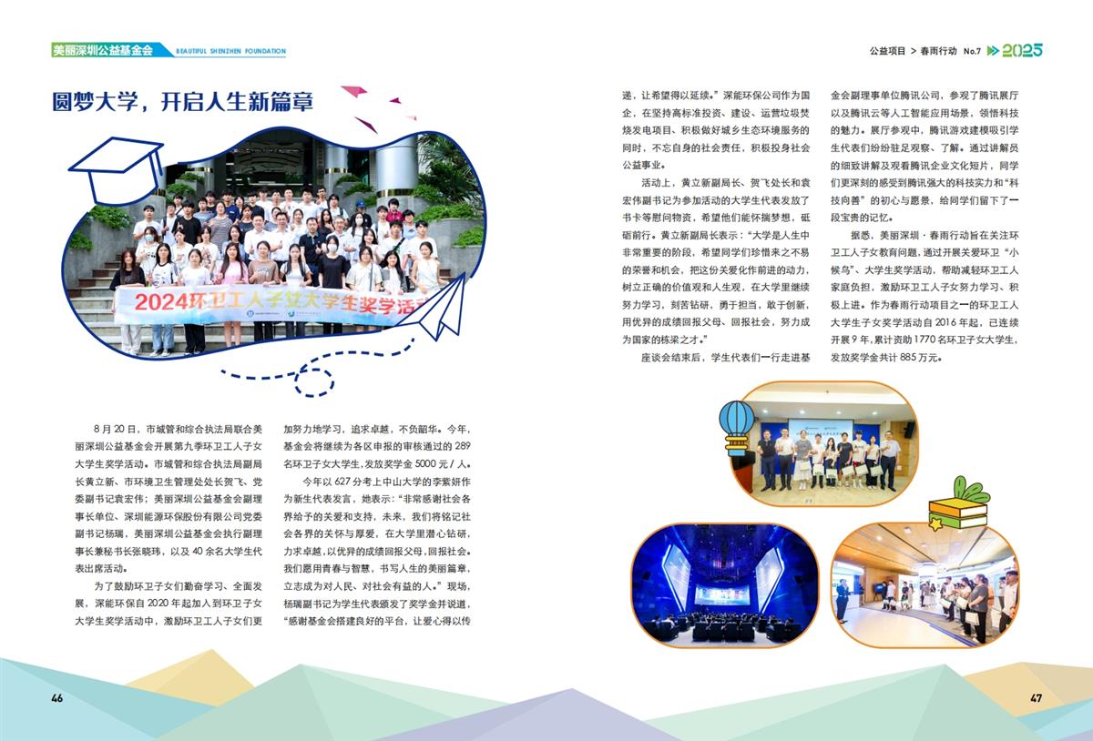 8月20日,市城管和综合执法局联合基金会开展第九季环卫工人子女大学生奖学活动座谈会,为参加活动的大学生代表发放了书卡等慰问物资。基金会为2024年考上大专以上的289名大学生发放奖学金5000元/人,激励环卫工人子女们更加努力地学习。座谈会结束后,学生代表们一行走进基金会副理事长单位腾讯公司,参观了腾讯展厅以及腾讯云等人工智能应用场景,领悟科技的魅力。