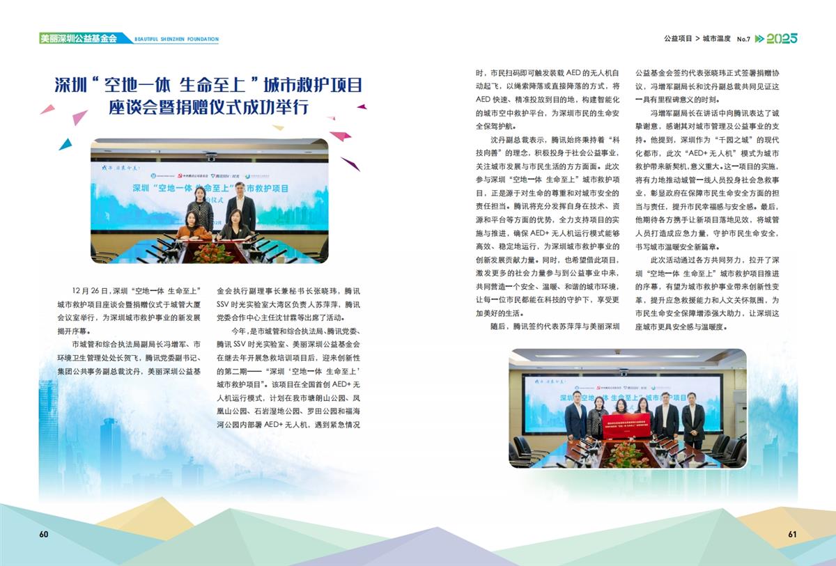 12月26日,深圳“空地一体 生命至 上’城市救护项目座谈会暨捐赠仪式于城管大厦会议室举行。该项目在全国首创AED+无人机运行模式,计划在我市塘朗山公园、凤凰山公园、石岩湿地公园、罗田公园和福海河公园内部署 AED+无人机,为深圳市民的生命安全保驾护航。