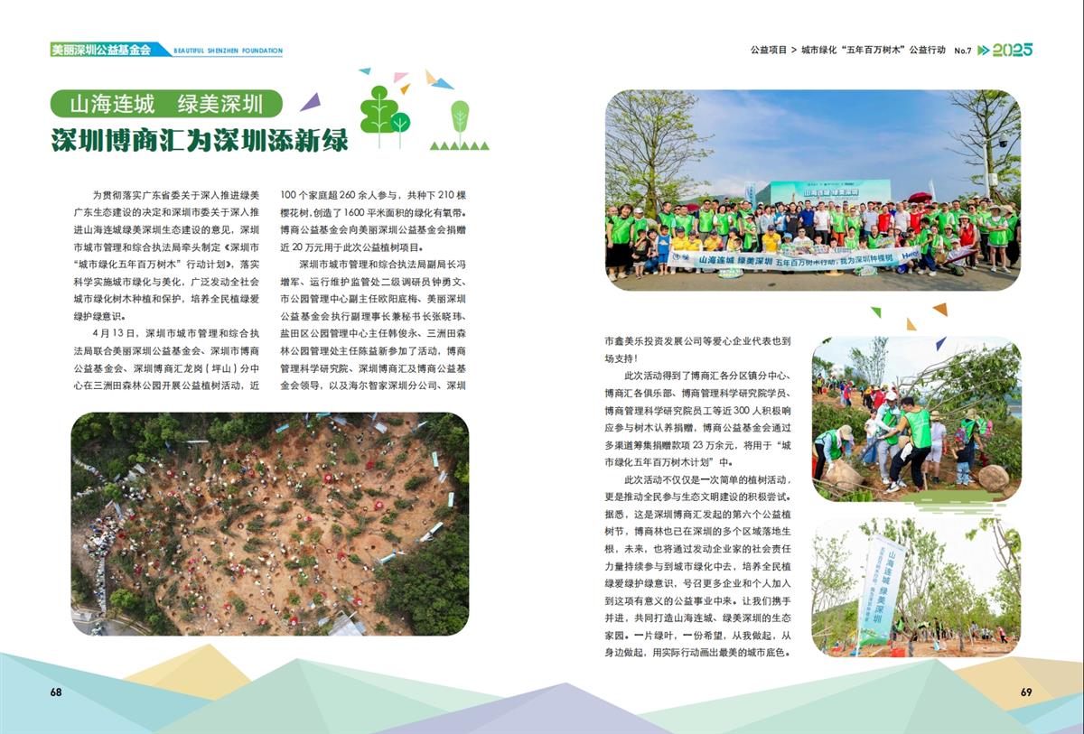 4月13日,市城管和综合执法局联合美丽深圳公益基金会、深圳市博商公益基金会、深圳博商汇龙岗(坪山)分中心近100个家庭超260余人,在三洲田森林公园种下210棵樱花树,创造了 1600平米面积的绿化有氧带。博商公益基金会向美丽深圳公益基金会捐赠近 20万元用于此次公益植树项目。