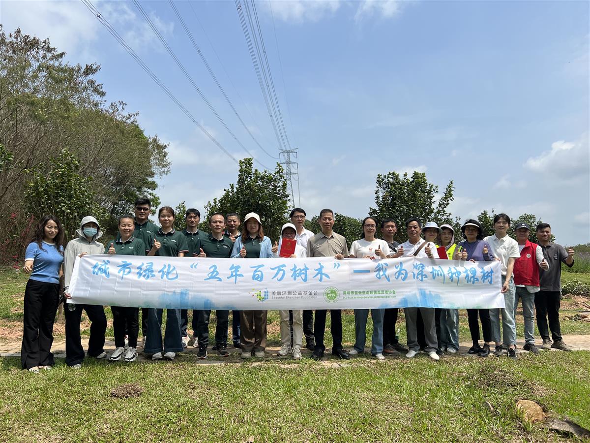 4月23日,美丽深圳公益基金会联合深圳市蓝天生态环保志愿者协会在宝安区五指耙公园共同组织开展公益植树活动。宝安区城市管理和综合执法局副局长刘宇晖、宝安区松岗街道党工委委员廖子崇、美丽深圳公益基金会副秘书长常青以及爱心企业代表参加活动,为深圳“五年百万树木”行动再添新绿,助力绘就人与自然和谐共生的生态画卷。