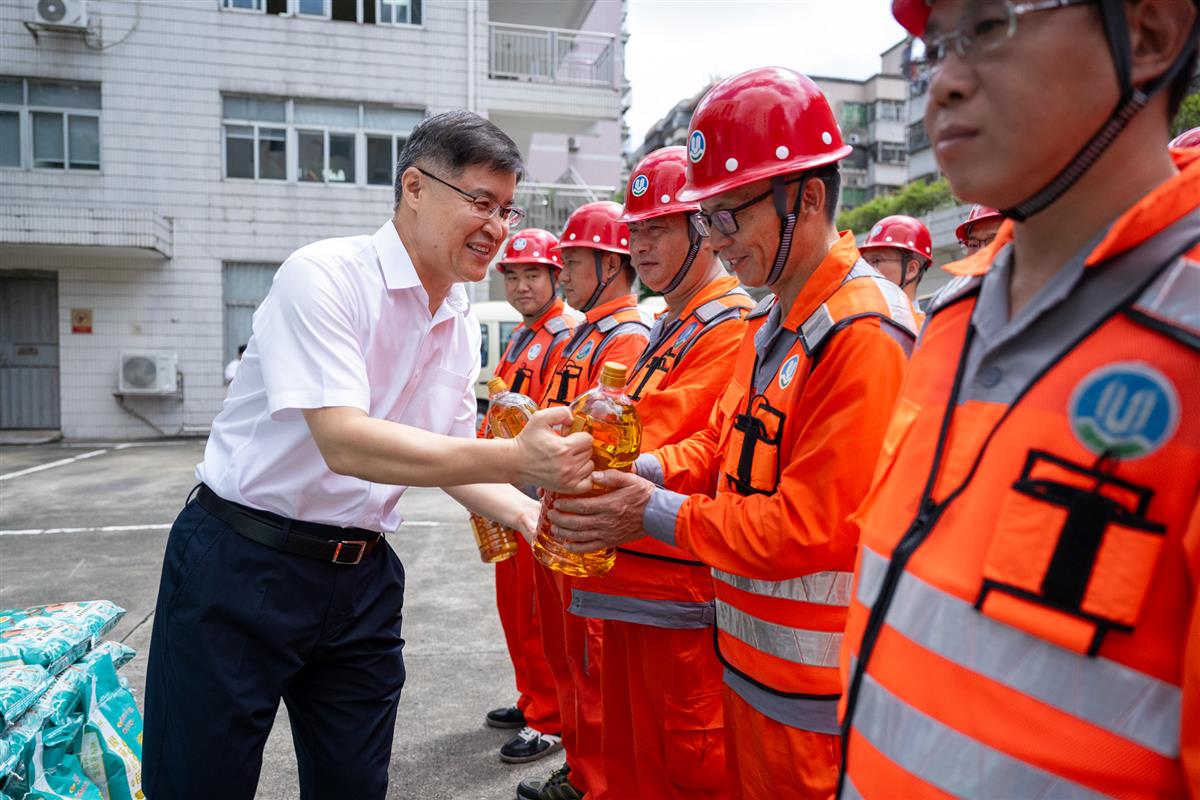 慰问活动现场,市城管和综合执法局领导与工人代表亲切交谈,详细了解大家在防台工作中的作业保障、身体状况及实际需求,对大家“以风为令、逆风而上”的责任担当给予高度肯定,同时反复叮嘱大家在开展后续工作时务必做好自身防护,合理安排作息,确保安全作业。此外,局领导借此机会,提前向大家致以国庆、中秋双节的美好祝福。